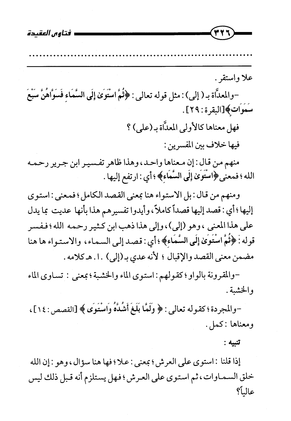 ومنهم من قال: بل الاستواء هنا بمعنى القصد الكامل؛ فمعنى: استوى إليها؛ أي: قصد إليها قصدا كاملا، وأيدوا تفسيرهم هذا بأنها عديت بما يدل على هذا المعنى، وهو (إلى) ، وإلى هذا ذهب ابن كثير رحمه الله؛ ففسر قوله: {ثُمَّ اسْتَوَى عَلَى الْعَرْشِ} ؛ أي: قصد إلى السماء، والاستواء ها هنا مضمن معنى القصد والإقبال؛ لأنه عدي بـ (إلى) .ا. هـ كلامه.
