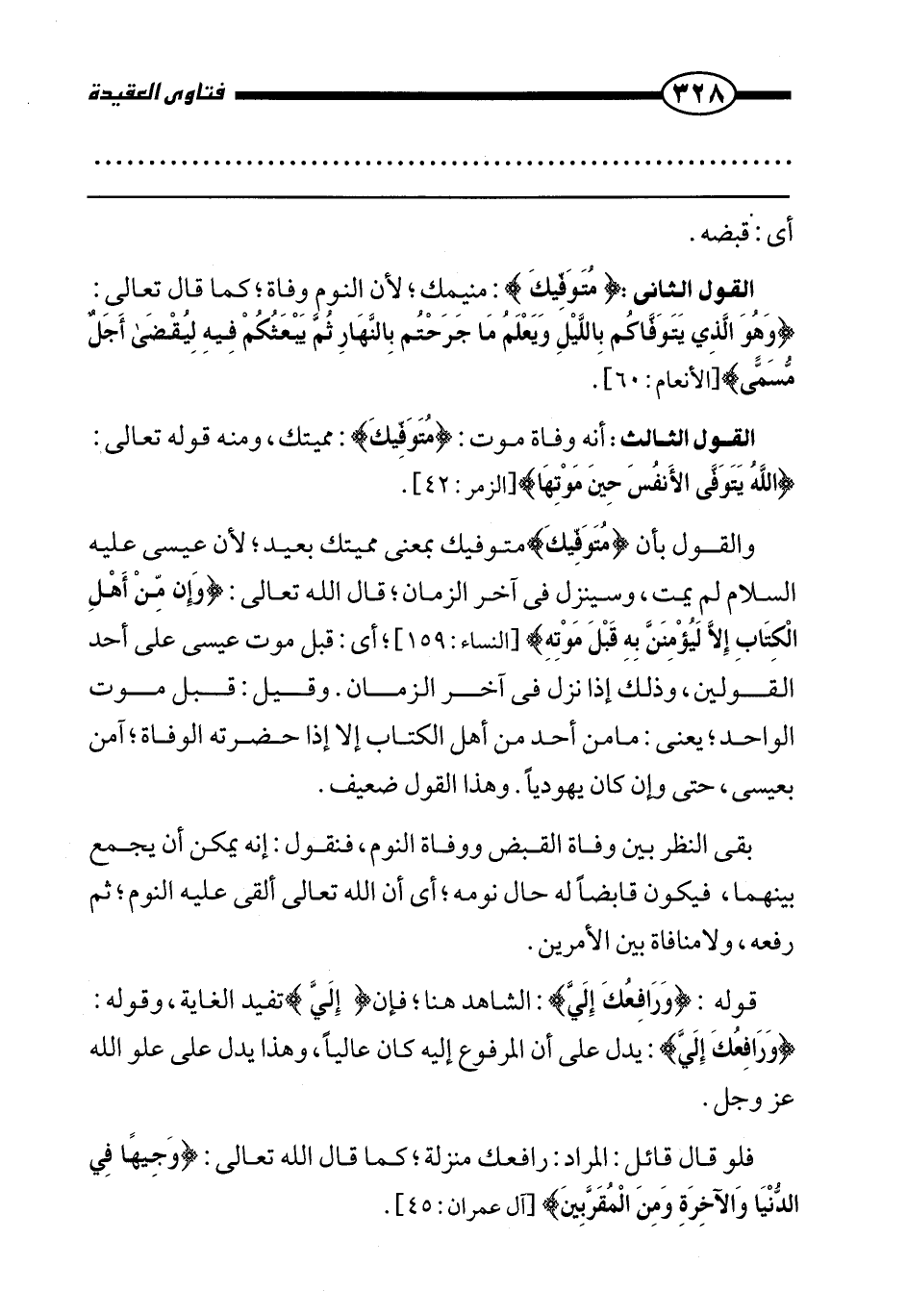 والقول بأن {مُتَوَفِّيكَ} متوفيك بمعنى مميتك بعيد؛ لأن عيسى عليه السلام لم يمت، وسينزل في آخر الزمان؛ قال الله تعالى: {وَإِنْ مِنْ أَهْلِ الْكِتَابِ إِلَّا لَيُؤْمِنَنَّ بِهِ قَبْلَ مَوْتِهِ} [النساء: 159] ؛ أي: قبل موت عيسى على أحد القولين، وذلك إذا نزل في آخر الزمان. وقيل: قبل موت الواحد؛ يعني: ما من أحد من أهل الكتاب إلا إذا حضرته الوفاة؛ آمن بعيسى، حتى وإن كان يهوديا. وهذا القول ضعيف.
