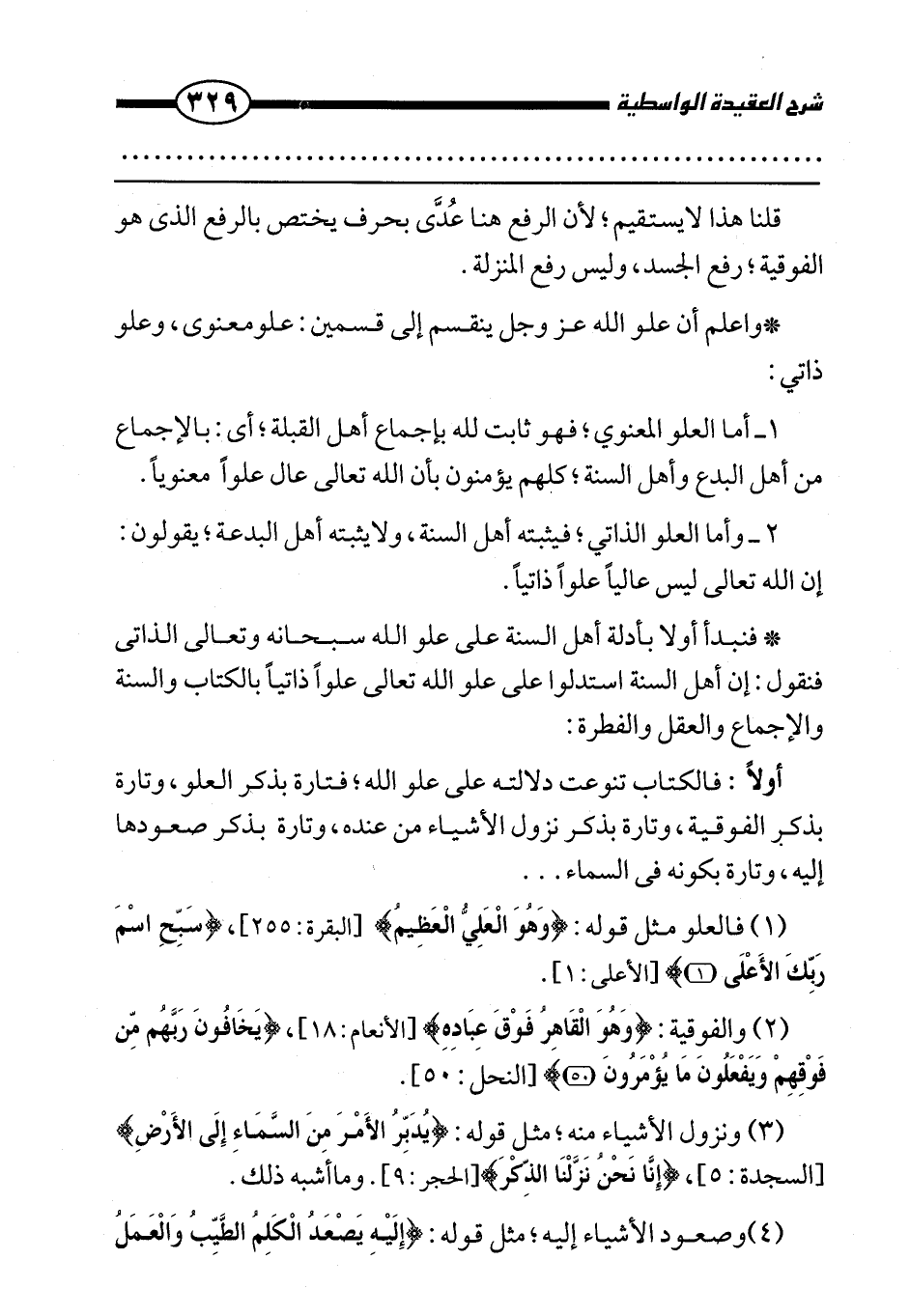 (1) فالعلو مثل قوله: {وَهُوَ الْعَلِيُّ الْعَظِيمُ} [البقرة: 255] ، {سَبِّحِ اسْمَ رَبِّكَ الْأَعْلَى} [الأعلى: 1] .