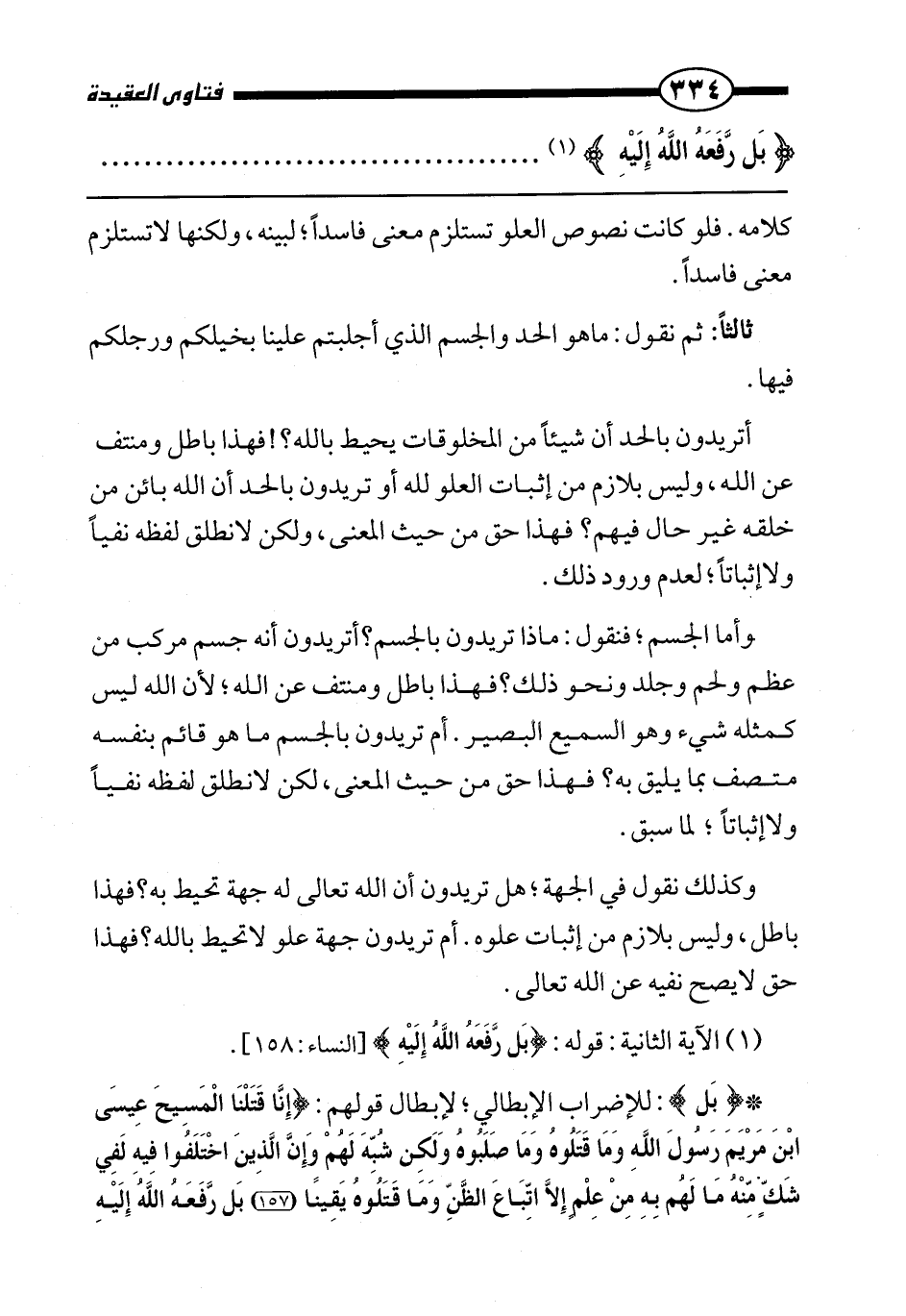 وكذلك نقول في الجهة، هل تريدون أن الله تعالى له جهة تحيط به؟ فهذا باطل، وليس بلازم من إثبات علوه. أم تريدون جهة علو لا تحيط بالله؟ فهذا حق لا يصح نفيه عن الله تعالى.