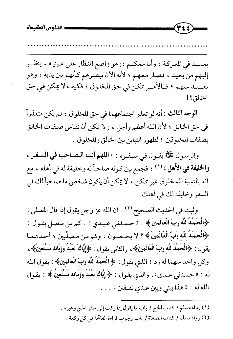 وثبت في الحديث الصحيح: أن الله عز وجل يقول إذا قال المصلي: {الْحَمْدُ لِلَّهِ رَبِّ الْعَالَمِينَ} : «حمدني عبدي» . كم من مصل يقول: {الْحَمْدُ لِلَّهِ رَبِّ الْعَالَمِينَ} ؟ لا يحصون، وكم من مصليين، أحدهما يقول: {الْحَمْدُ لِلَّهِ رَبِّ الْعَالَمِينَ} ، والثاني يقول: {إِيَّاكَ نَعْبُدُ وَإِيَّاكَ نَسْتَعِينُ} ، وكل واحد منهما له رد، الذي يقول: {الْحَمْدُ لِلَّهِ رَبِّ الْعَالَمِينَ} : يقول الله له: «حمدني عبدي» . والذي يقول: {إِيَّاكَ نَعْبُدُ وَإِيَّاكَ نَسْتَعِينُ} : يقول الله له: «هذا بيني وبين عبدي نصفين» ...