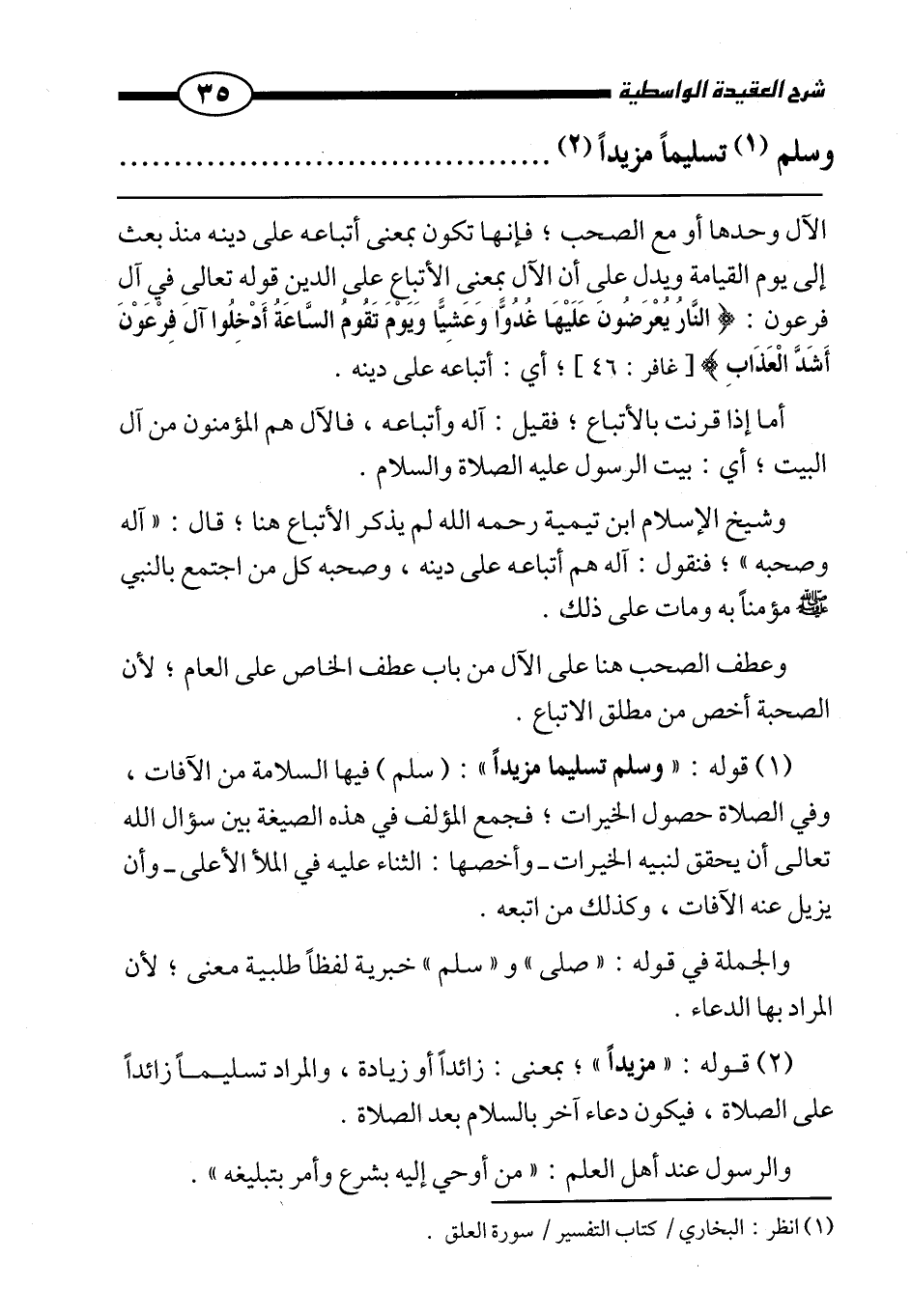 الآل وحدها أو مع الصحب، فإنها تكون بمعنى أتباعه على دينه منذ بعث إلى يوم القيامة ويدل على أن الآل بمعنى الأتباع على الدين قوله تعالى في آل فرعون: {النَّارُ يُعْرَضُونَ عَلَيْهَا غُدُوًّا وَعَشِيًّا وَيَوْمَ تَقُومُ السَّاعَةُ أَدْخِلُوا آلَ فِرْعَوْنَ أَشَدَّ الْعَذَابِ} [غافر: 46] ، أي: أتباعه على دينه.