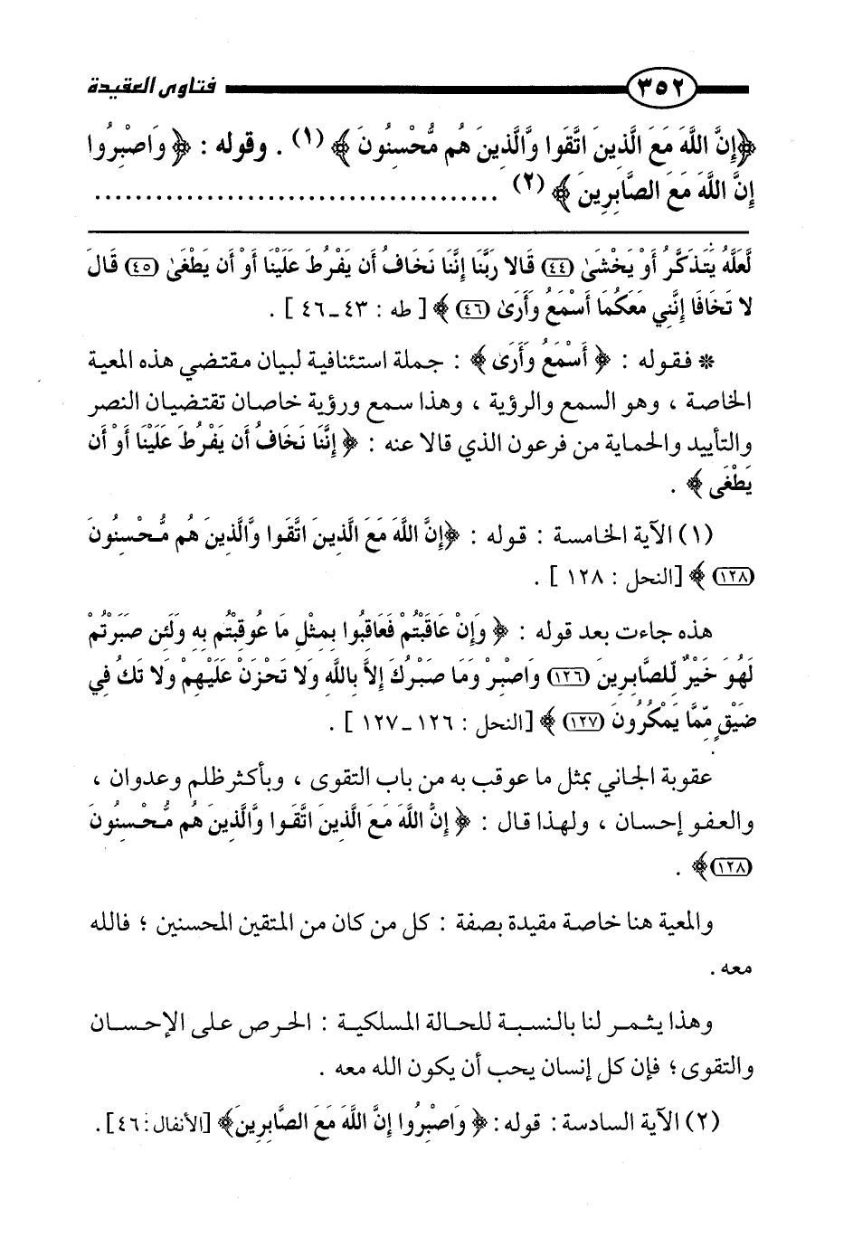 الآية الخامسة: قوله: {إِنَّ اللَّهَ مَعَ الَّذِينَ اتَّقَوْا وَالَّذِينَ هُمْ مُحْسِنُونَ} [النحل: 128] .