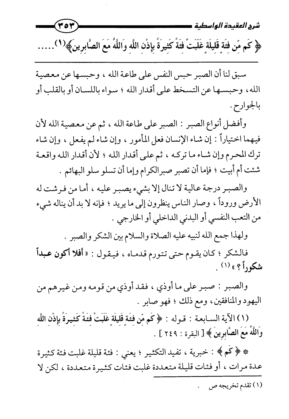وأفضل أنواع الصبر: الصبر على طاعة الله، ثم عن معصية الله؛ لأن فيهما اختيارا: إن شاء الإنسان فعل المأمور، وإن شاء لم يفعل، وإن شاء ترك المحرم وإن شاء ما تركه، ثم على أقدار الله؛ لأن أقدار الله واقعة شئت أم أبيت؛ فإما أن تصبر صبر الكرام وإما أن تسلو سلو البهائم.