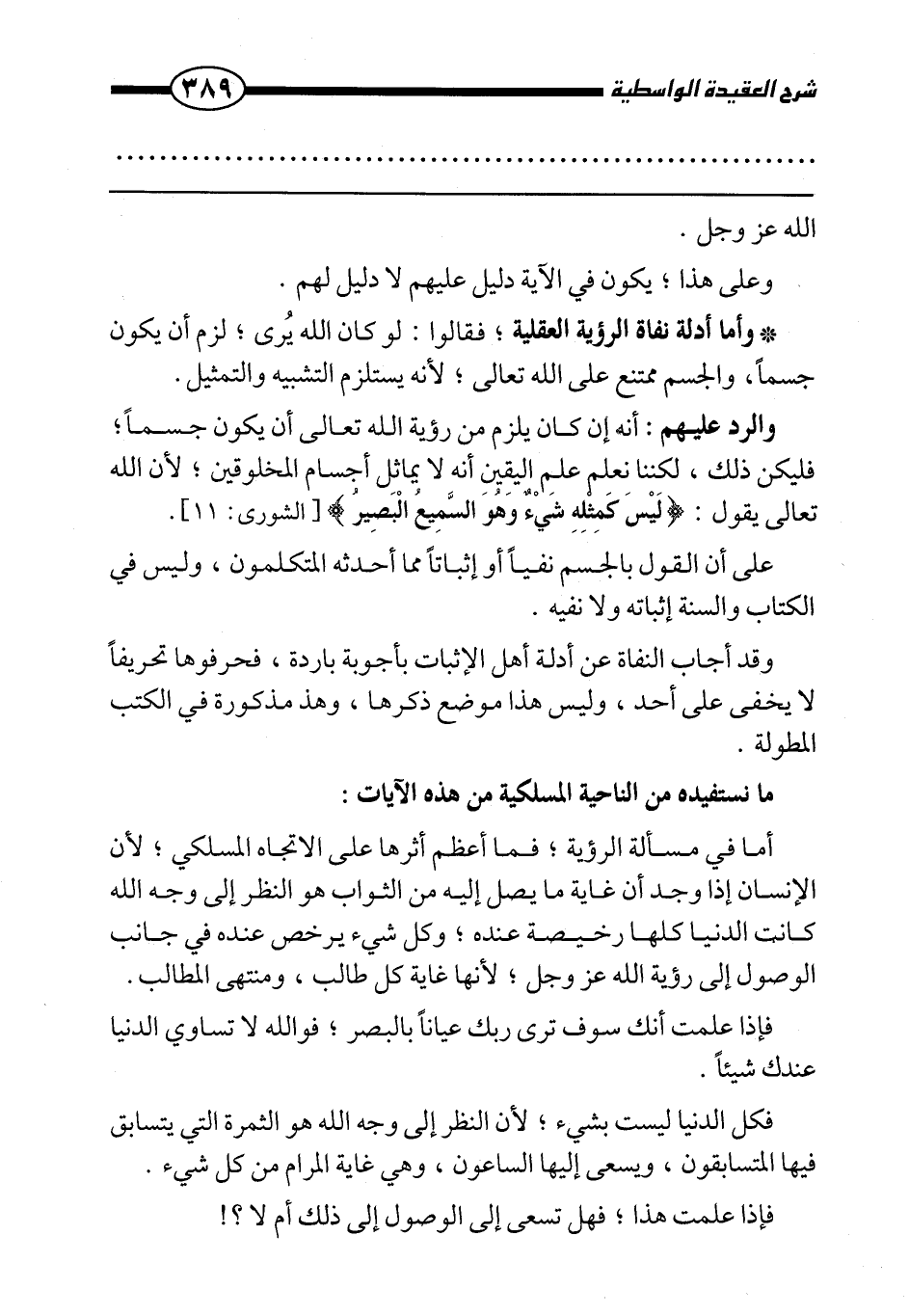 وأما أدلة نفاة الرؤية العقلية: فقالوا: لو كان الله يرى؛ لزم أن يكون جسما، والجسم ممتنع على الله تعالى؛ لأنه يستلزم التشبيه والتمثيل.