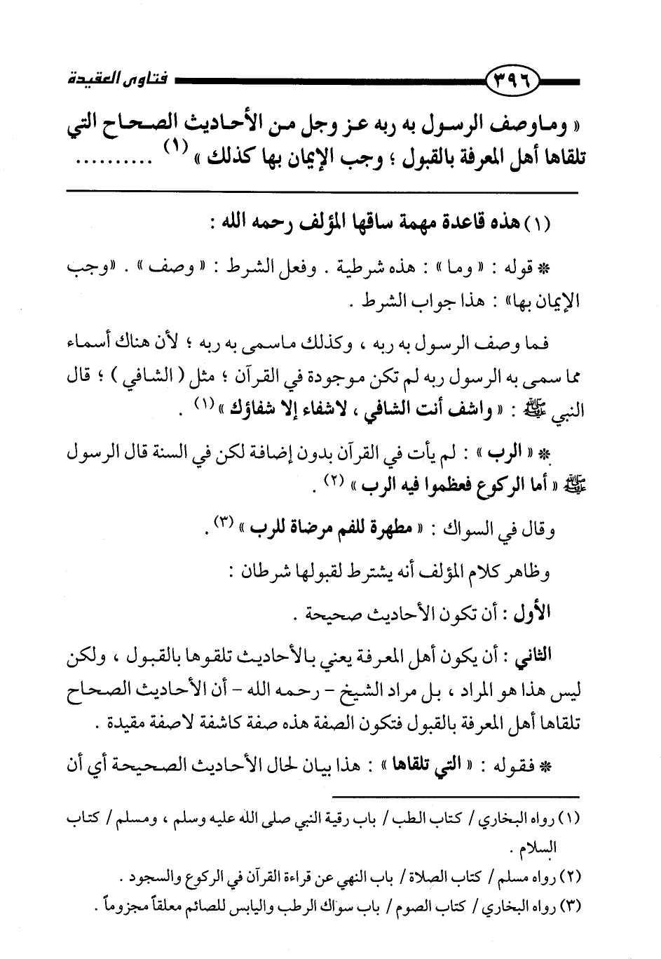 الثاني: أن يكون أهل المعرفة يعني بالأحاديث تلقوها بالقبول، ولكن ليس هذا هو المراد، بل مراد الشيخ -رحمه الله- أن الأحاديث الصحاح تلقاها أهل المعرفة بالقبول فتكون الصفة هذه صفة كاشفة لا صفة مقيدة.