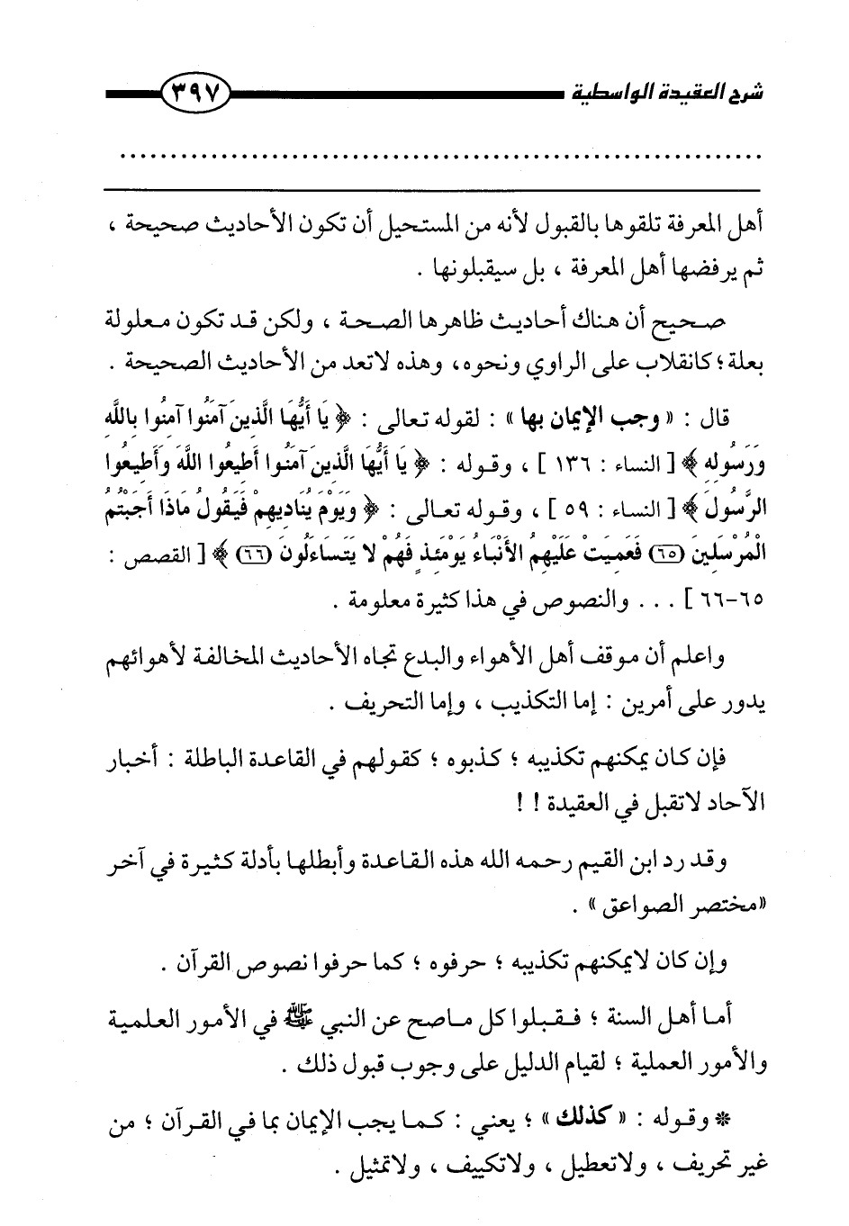 قال: " وجب الإيمان بها ": لقوله تعالى: {يَا أَيُّهَا الَّذِينَ آمَنُوا آمِنُوا بِاللَّهِ وَرَسُولِهِ} [النساء:136] ، وقوله: {يَا أَيُّهَا الَّذِينَ آمَنُوا أَطِيعُوا اللَّهَ وَأَطِيعُوا الرَّسُولَ} [النساء:59] ، وقوله تعالى: {وَيَوْمَ يُنَادِيهِمْ فَيَقُولُ مَاذَا أَجَبْتُمُ الْمُرْسَلِينَ فَعَمِيَتْ عَلَيْهِمُ الْأَنْبَاءُ يَوْمَئِذٍ فَهُمْ لَا يَتَسَاءَلُونَ} [القصص: 65 - 66] ... والنصوص في هذا كثيرة معلومة.