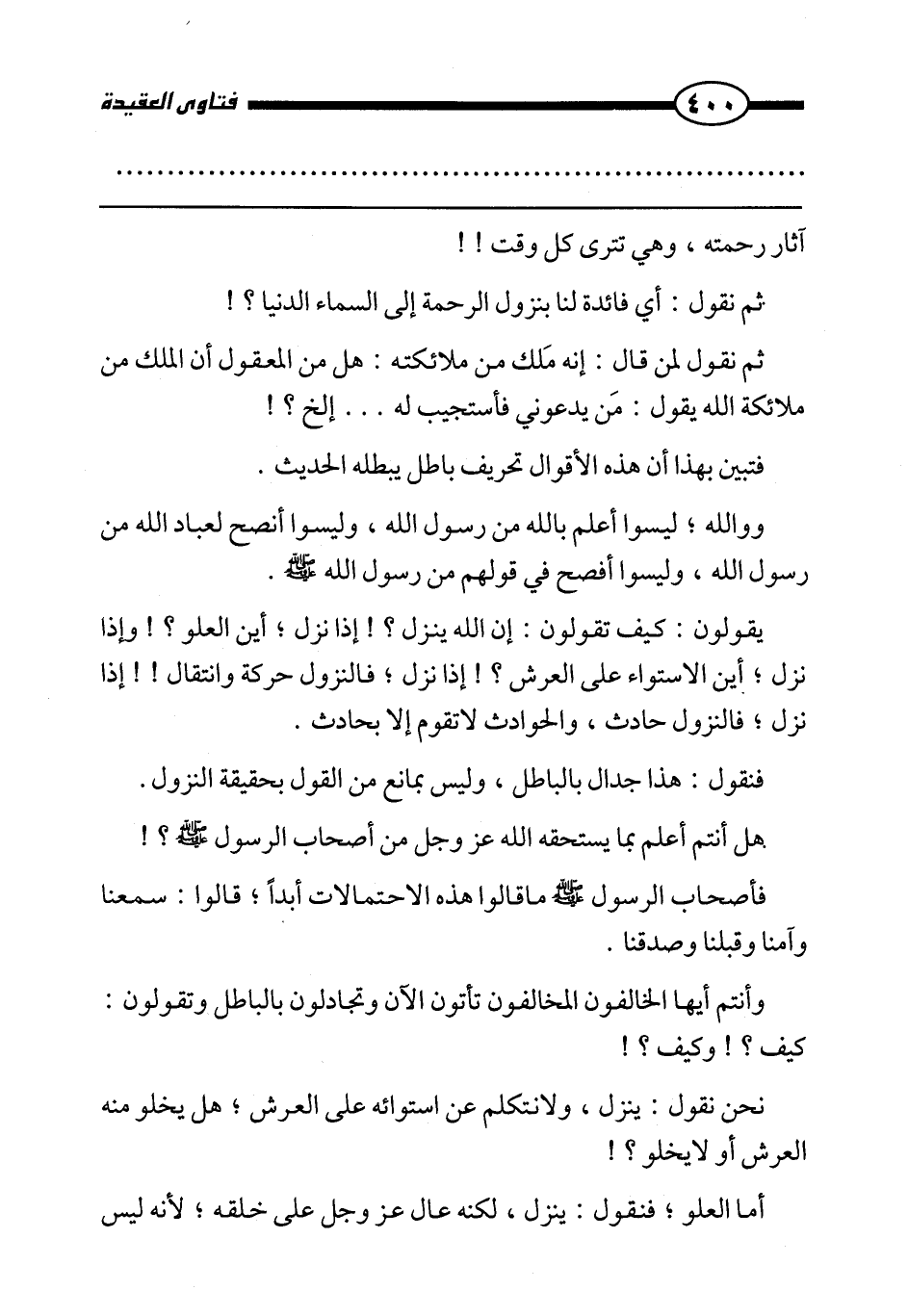 يقولون: كيف تقولون: إن الله ينزل؟ إذا نزل؛ أين العلو؟ وإذا نزل؛ أين الاستواء على العرش؟ إذا نزل؛ فالنزول حركة وانتقال. إذا نزل؛ فالنزول حادث، والحوادث لا تقوم إلا بحادث.