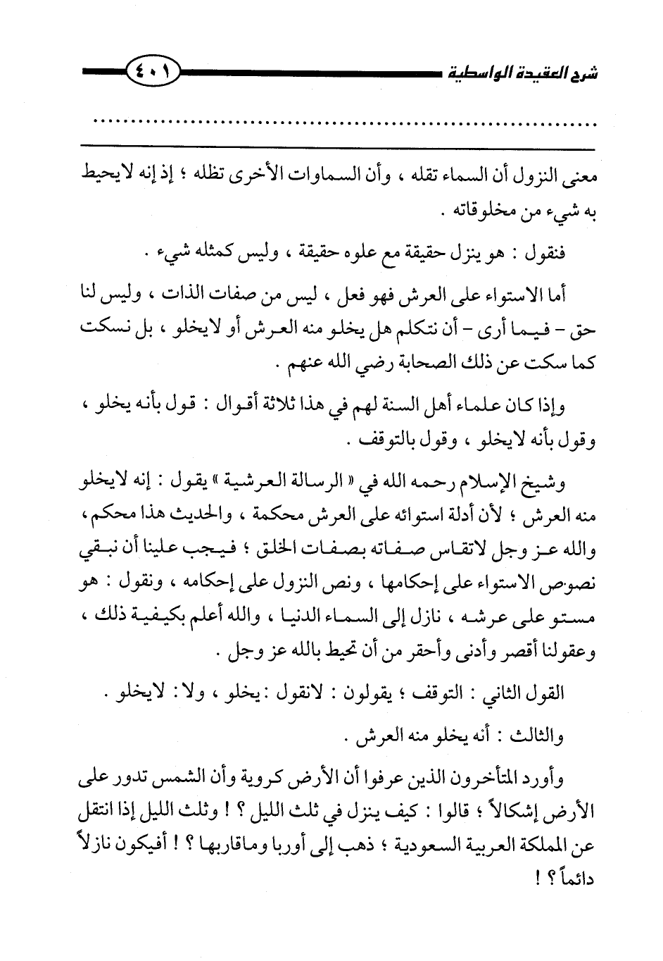 والثالث: أنه يخلو منه العرش. وأورد المتأخرون الذين عرفوا أن الأرض كروية وأن الشمس تدور على الأرض إشكالا؛ قالوا: كيف ينزل في ثلث الليل؟ وثلث الليل إذا انتقل عن المملكة العربية السعودية؛ ذهب إلى أوربا وما قاربها؟ أفيكون نازلا دائما؟