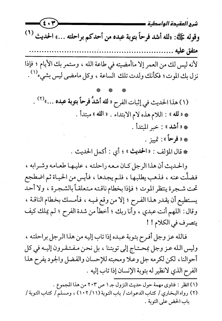 فالله عز وجل أفرح بتوبة عبده إذا تاب إليه من هذا الرجل براحلته، وليس الله عز وجل بمحتاج إلى توبتنا، بل نحن مفتقرون إليه في كل أحوالنا لكن لكرمه جل وعلا ومحبته للإحسان والفضل والجود يفرح هذا الفرح الذي لا نظير له بتوبة الإنسان إذا تاب إليه.