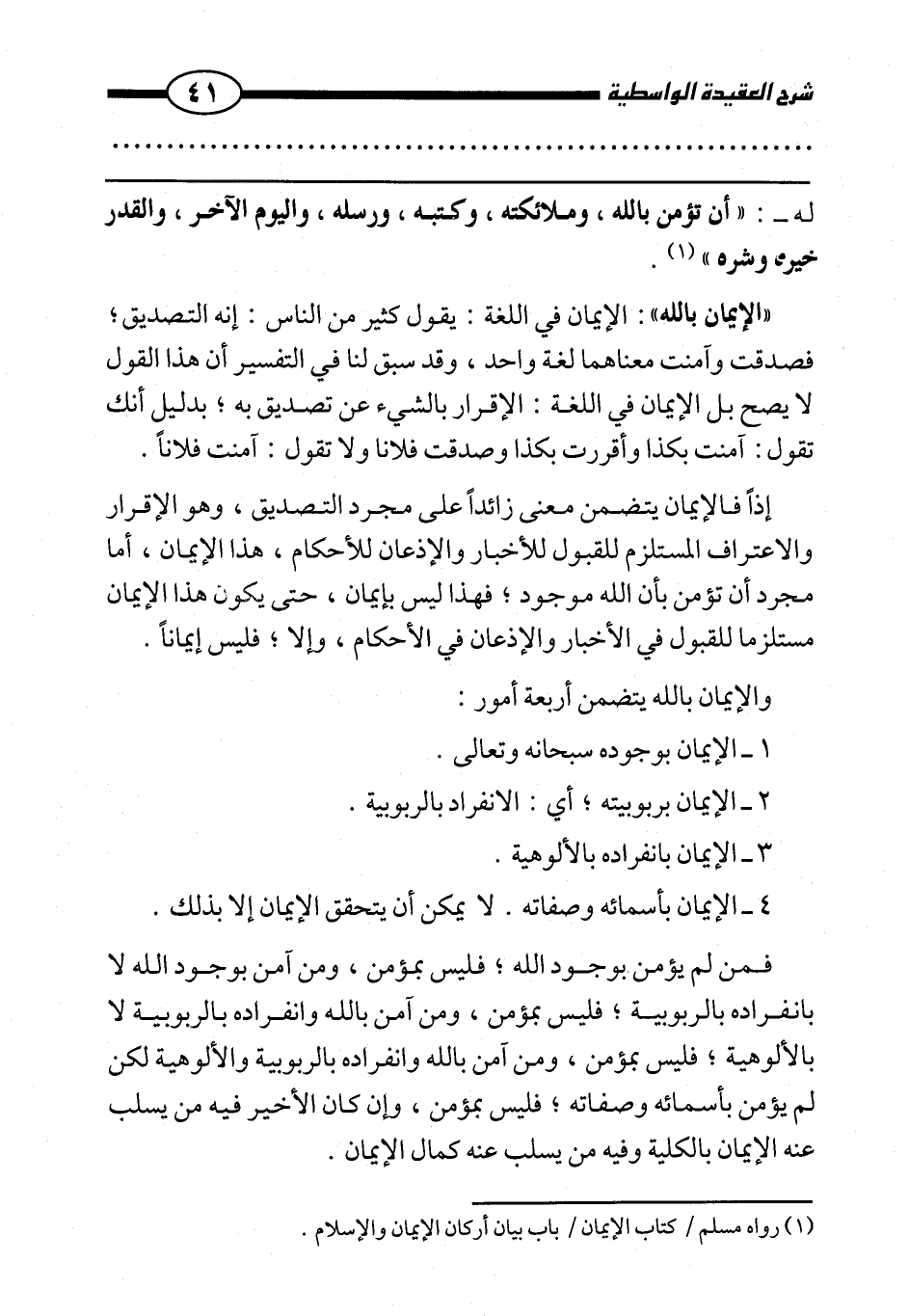 " الإيمان بالله ": الإيمان في اللغة: يقول كثير من الناس: إنه التصديق؛ فصدقت وآمنت معناهما لغة واحد، وقد سبق لنا في التفسير أن هذا القول لا يصح بل الإيمان في اللغة: الإقرار بالشيء عن تصديق به؛ بدليل أنك تقول: آمنت بكذا وأقررت بكذا وصدقت فلانًا ولا تقول: آمنت فلانًا.