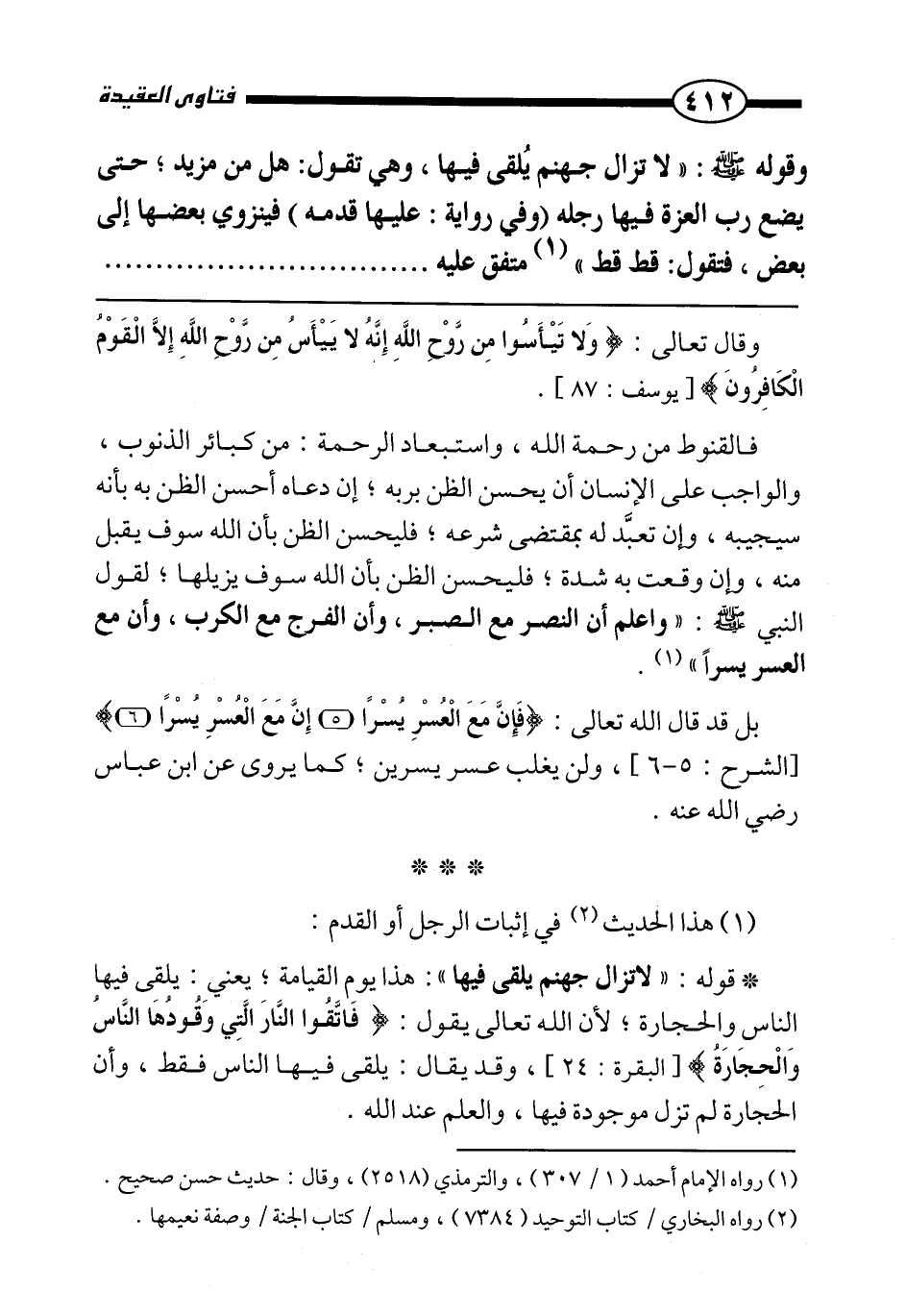 وقوله صَلَّى اللَّهُ عَلَيْهِ وَسَلَّمَ: «لا تزال جهنم يلقى فيها، وهى تقول: هل من مزيد؛ حتى يضع رب العزة فيها رجله (وفي رواية: عليها قدمه) فينزوي بعضها إلى بعض، فتقول: قط قط.» متفق عليه.