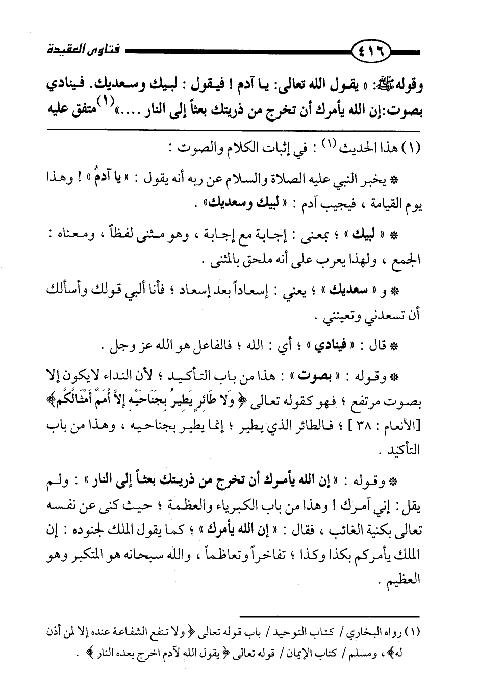 وقوله صَلَّى اللَّهُ عَلَيْهِ وَسَلَّمَ: «يقول الله تعالى: يا آدم. فيقول: لبيك وسعديك. فينادي بصوت: إن الله يأمرك أن تخرج من ذريتك بعثا إلى النار....» متفق عليه.
