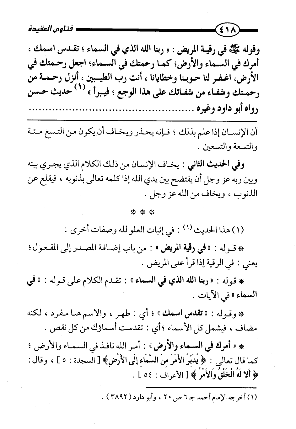 وقوله صَلَّى اللَّهُ عَلَيْهِ وَسَلَّمَ في رقية المريض: «ربنا الله الذي في السماء، تقدس اسمك، أمرك في السماء والأرض؛ كما رحمتك في السماء؛ اجعل رحمتك في الأرض، اغفر لنا حوبنا وخطايانا، أنت رب الطيبين، أنزل رحمة من رحمتك وشفاء من شفائك على هذا الوجع؛ فيبرأ» حديث حسن رواه أبو داود وغيره.
