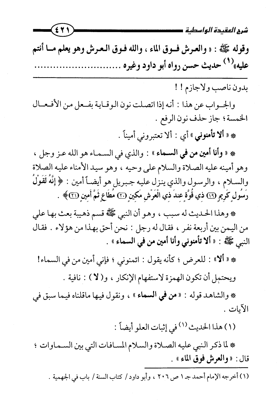 وقوله صَلَّى اللَّهُ عَلَيْهِ وَسَلَّمَ «والعرش فوق الماء، والله فوق العرش وهو يعلم ما أنتم عليه» حديث حسن رواه أبو داود وغيره.