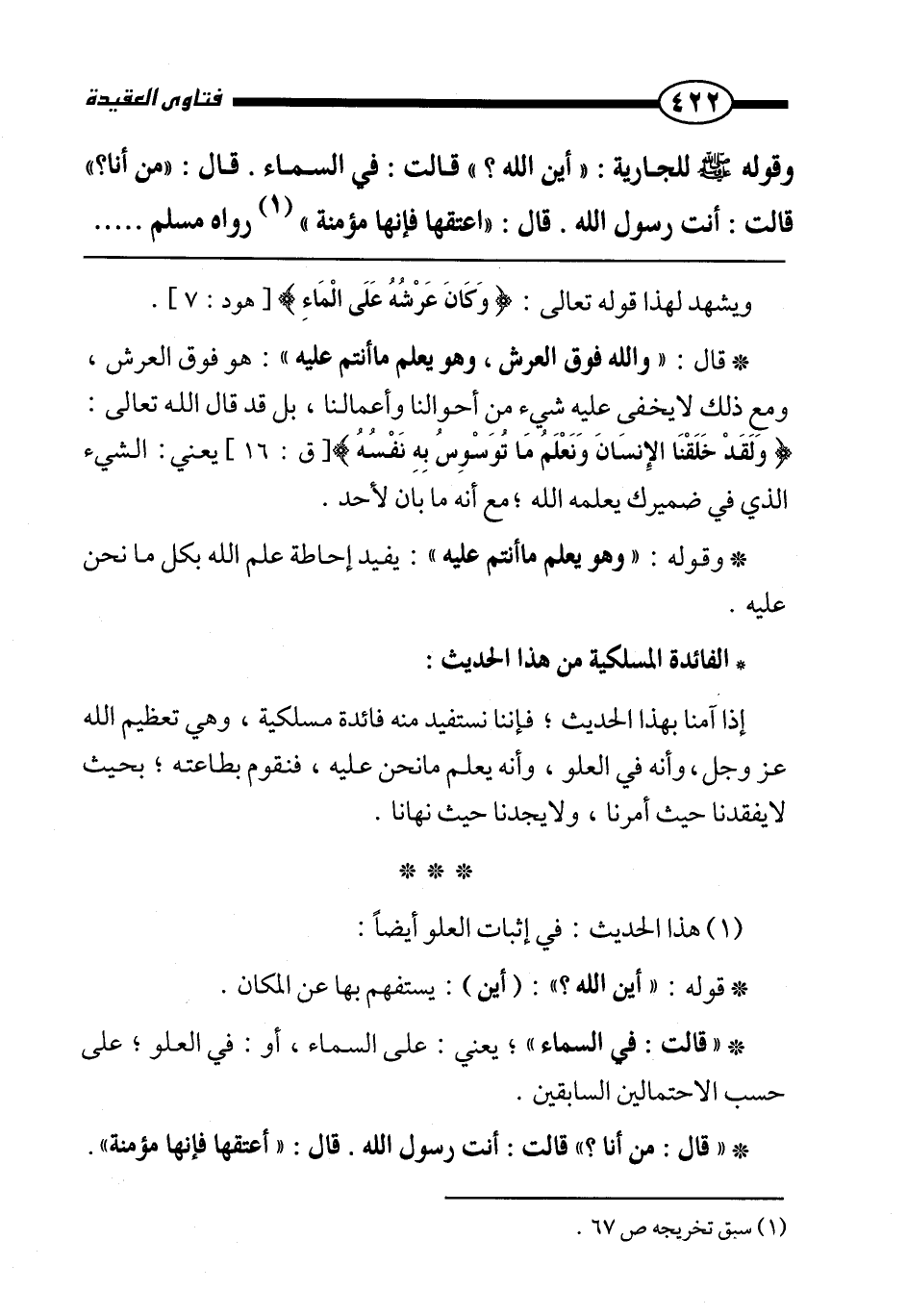 «وقوله صَلَّى اللَّهُ عَلَيْهِ وَسَلَّمَ للجارية: "أين الله؟ " قالت: في السماء. قال: "من أنا؟ " قالت: أنت رسول الله. قال: "اعتقها فإنها مؤمنة» رواه مسلم.
