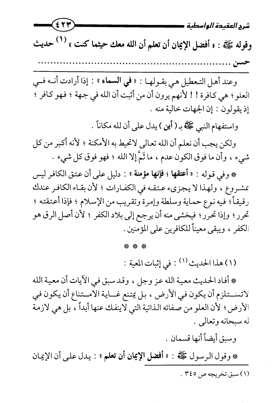 وقوله صَلَّى اللَّهُ عَلَيْهِ وَسَلَّمَ: «أفضل الإيمان أن تعلم أن الله معك حيثما كنت» حديث حسن.