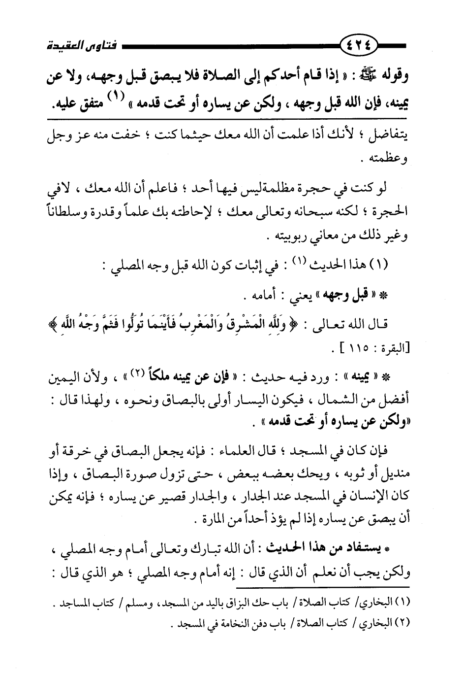 وقوله -صَلَّى اللَّهُ عَلَيْهِ وَسَلَّمَ-: «إذا قام أحدكم إلى الصلاة فلا يبصق قبل وجهه، ولا عن يمينه ولكن عن يساره أو تحت قدمه» متفق عليه.