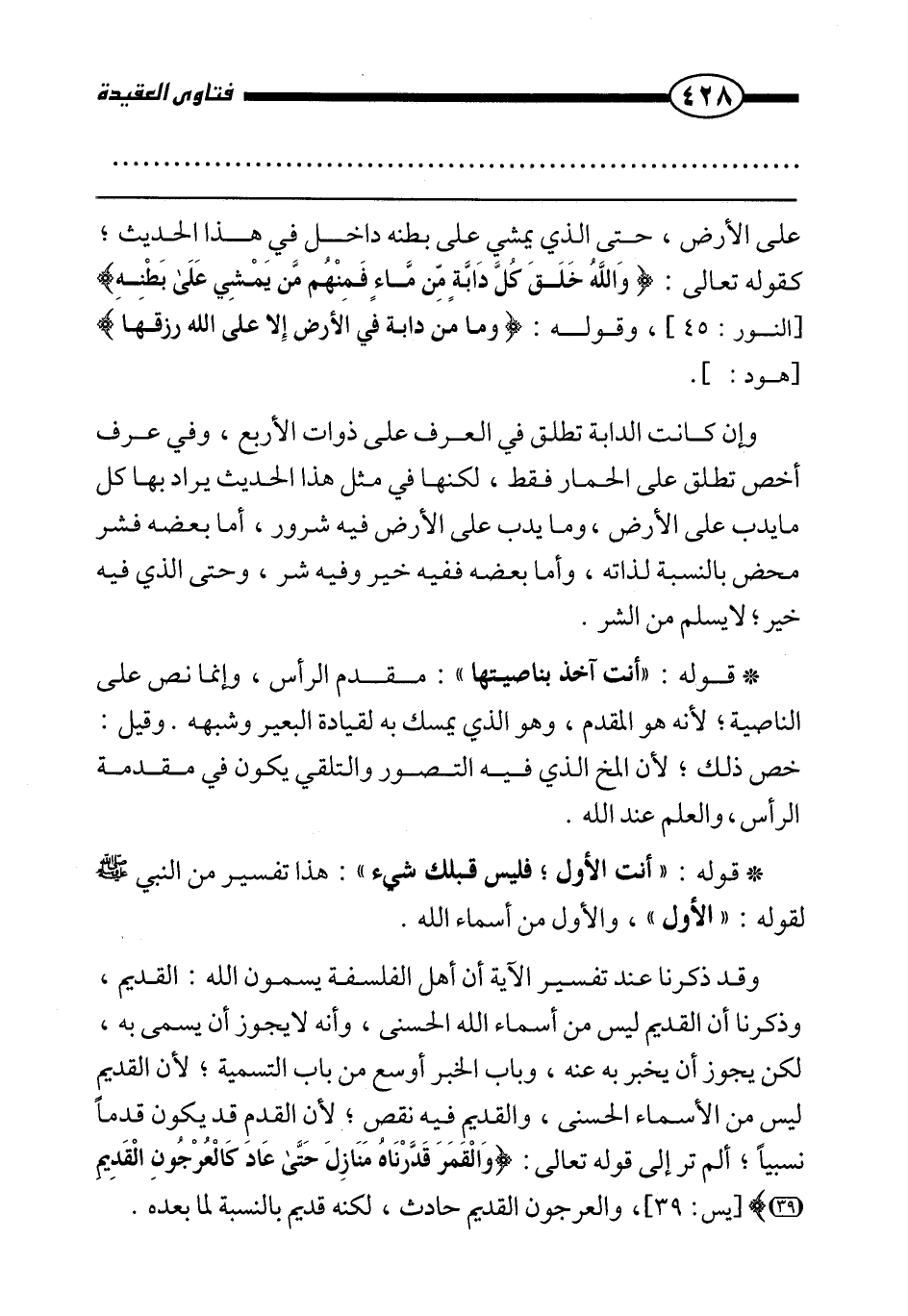 وقد ذكرنا عند تفسير الآية أن أهل الفلسفة يسمون الله: القديم، وذكرنا أن القديم ليس من أسماء الله الحسنى، وأنه لا يجوز أن يسمى به، لكن يجوز أن يخبر به عنه، وباب الخبر أوسع من باب التسمية؛ لأن القديم ليس من الأسماء الحسنى، والقديم فيه نقص؛ لأن القدم قد يكون قدما نسبيا؛ ألم تر إلى قوله تعالى: {وَالْقَمَرَ قَدَّرْنَاهُ مَنَازِلَ حَتَّى عَادَ كَالْعُرْجُونِ الْقَدِيمِ} [يس:39] ، والعرجون القديم حادث، لكنه قديم بالنسبة لما بعده.