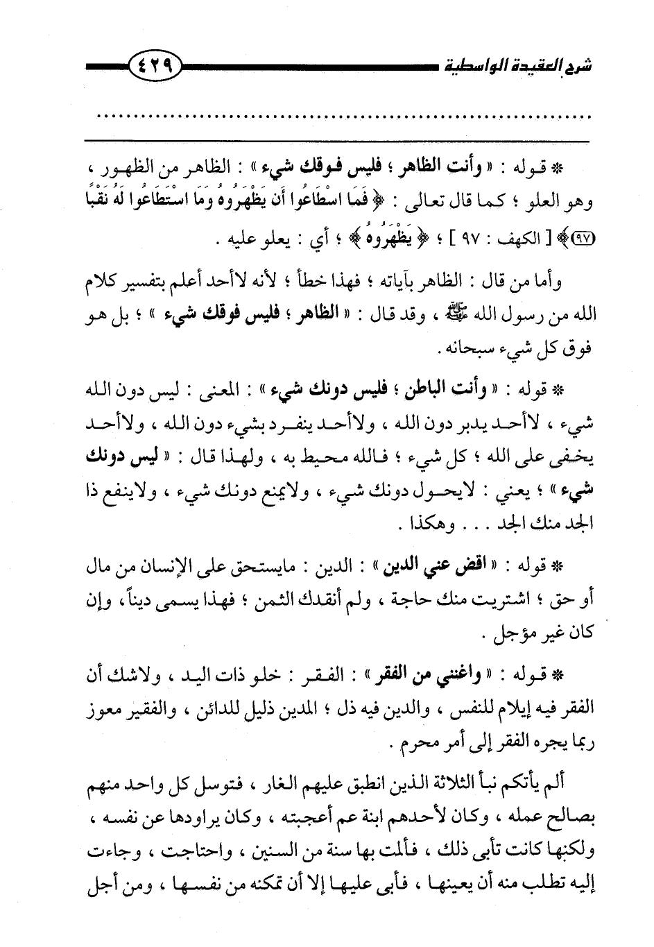 وأما من قال: الظاهر بآياته؛ فهذا خطأ؛ لأنه لا أحد أعلم بتفسير كلام الله من رسول الله صَلَّى اللَّهُ عَلَيْهِ وَسَلَّمَ، وقد قال: " «الظاهر؛ فليس فوقك شيء» ؛ بل هو فوق كل شيء سبحانه.