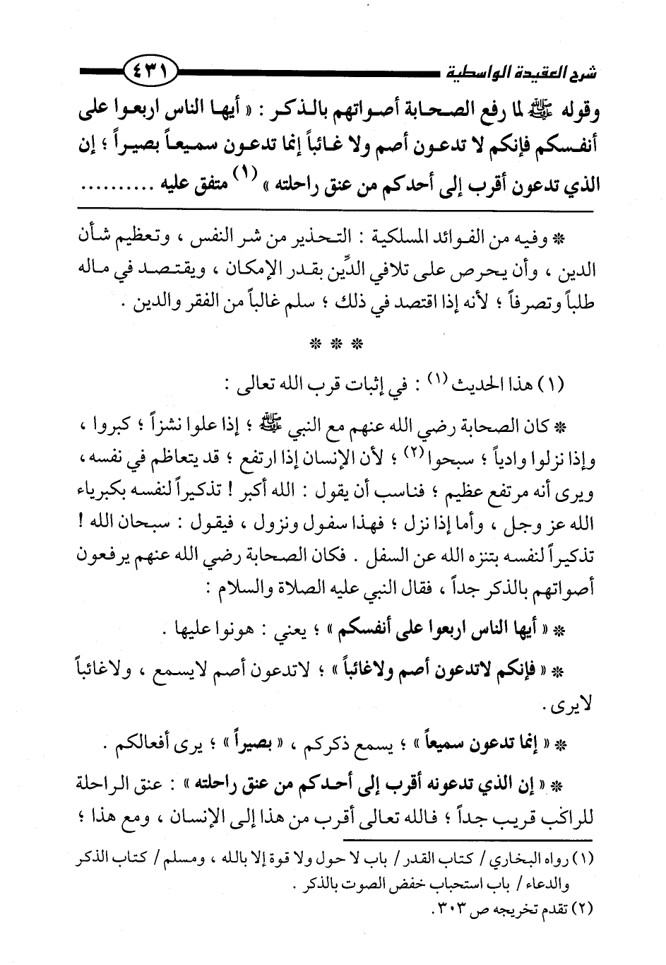 «وقوله صَلَّى اللَّهُ عَلَيْهِ وَسَلَّمَ لما رفع الصحابة أصواتهم بالذكر: " أيها الناس اربعوا على أنفسكم فإنكم لا تدعون أصم ولا غائبا إنما تدعون سميعا بصيرا؛ إن الذي تدعون أقرب إلى أحدكم من عنق راحلته» متفق عليه.