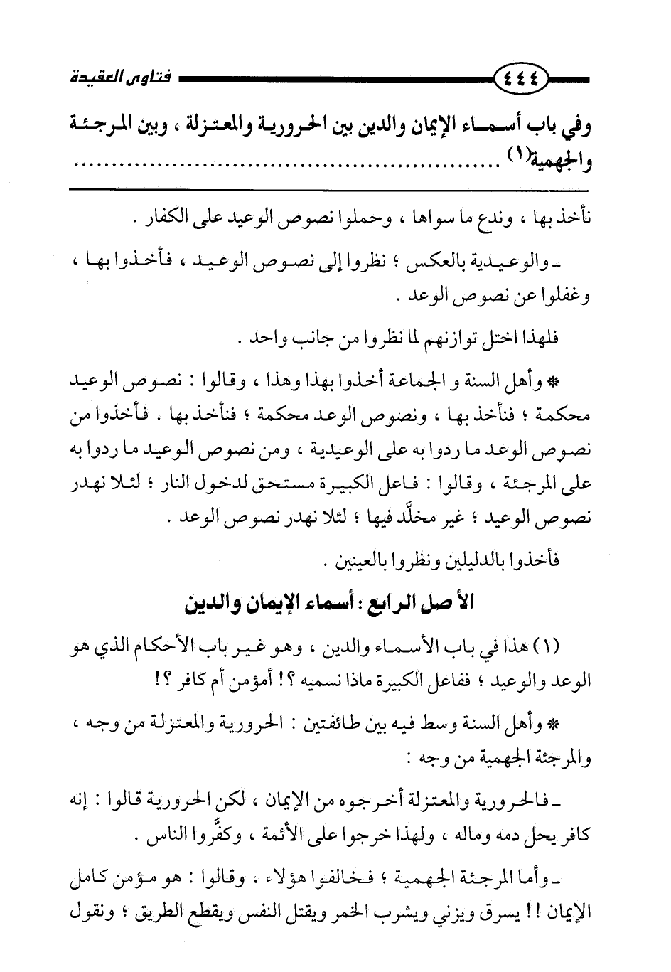 هذا في باب الأسماء والدين، وهو غير باب الأحكام الذي هو الوعد والوعيد؛ ففاعل الكبيرة ماذا نسميه؟ أمؤمن أم كافر؟