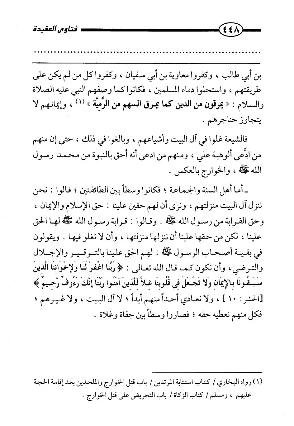بن أبي طالب، وكفروا معاوية بن أبي سفيان، وكفروا كل من لم يكن على طريقتهم، واستحلوا دماء المسلمين، فكانوا كما وصفهم النبي عليه الصلاة والسلام: «يمرقون من الدين كما يمرق السهم من الرمية» ، وإيمانهم لا يتجاوز حناجرهم.