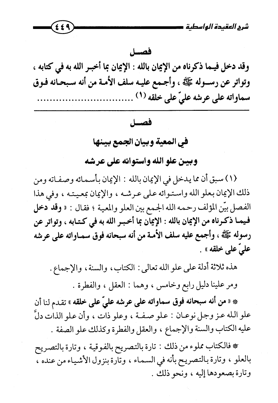 سبق أن مما يدخل في الإيمان بالله: الإيمان بأسمائه وصفاته ومن ذلك الإيمان بعلو الله واستوائه على عرشه، والإيمان بمعيته وفي هذا الفصل بين المؤلف رحمه الله الجمع بين العلو والمعية، فقال: وقد دخل فيما ذكرناه من الإيمان بالله: الإيمان بما أخبر الله به في كتابه، وتواتر عن رسوله صَلَّى اللَّهُ عَلَيْهِ وَسَلَّمَ وأجمع عليه سلف الأمة من أنه سبحانه فوق سماواته على عرشه عليّ على خلقه.