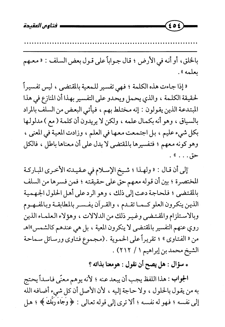إلى أن قال: " ولهذا، شيخ الإسلام في عقيدته الأخرى المباركة المختصرة، بين أن قوله: معهم، حق على حقيقته، فمن فسرها من السلف بالمقتضى فلحاجة دعت إلى ذلك وهو الرد على أهل الحلول الجهمية الذين ينكرون العلو كما تقدم، والقرآن يفسر بالمطابقة وبالمفهوم وبالاستلزام والمقتضى وغير ذلك من الدلالات، وهؤلاء العلماء الذين روي عنهم التفسير بالمقتضى لا ينكرون المعية، بل هي عندهم كالشمس " اهـ من "الفتاوى"، تقريرا على الحموية. (مجموع فتاوى ورسائل سماحة الشيخ محمد بن إبراهيم 1 \12) .