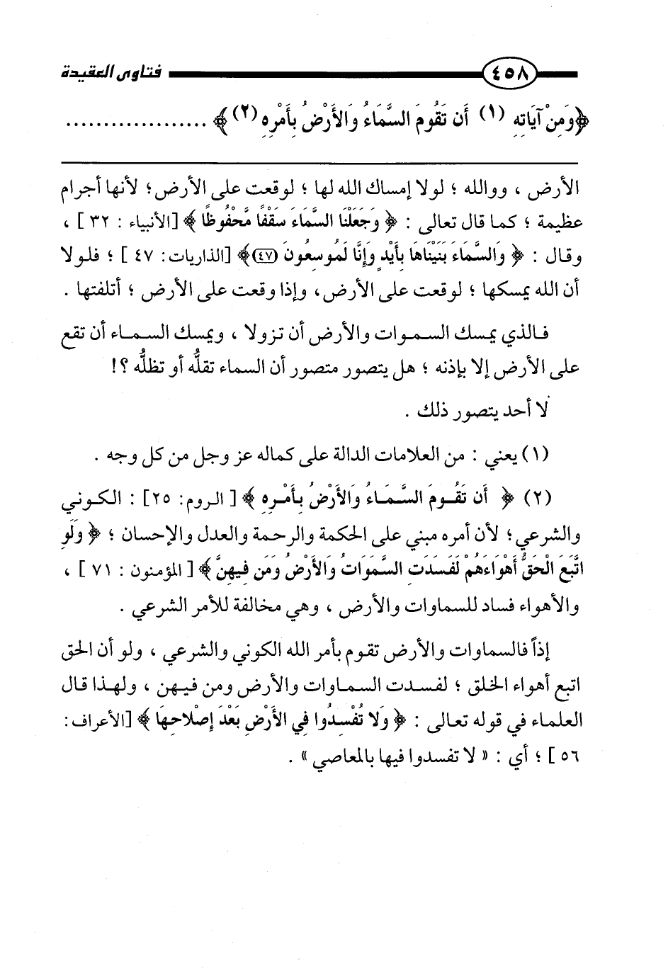 {أَنْ تَقُومَ السَّمَاءُ وَالْأَرْضُ بِأَمْرِهِ} [الروم: 25] الكوني والشرعي لأن أمره مبني على الحكمة والرحمة والعدل والإحسان، {وَلَوِ اتَّبَعَ الْحَقُّ أَهْوَاءَهُمْ لَفَسَدَتِ السَّمَاوَاتُ وَالْأَرْضُ وَمَنْ فِيهِنَّ} [المؤمنون: 71] والأهواء فساد للسماوات والأرض، وهي مخالفة للأمر الشرعي.