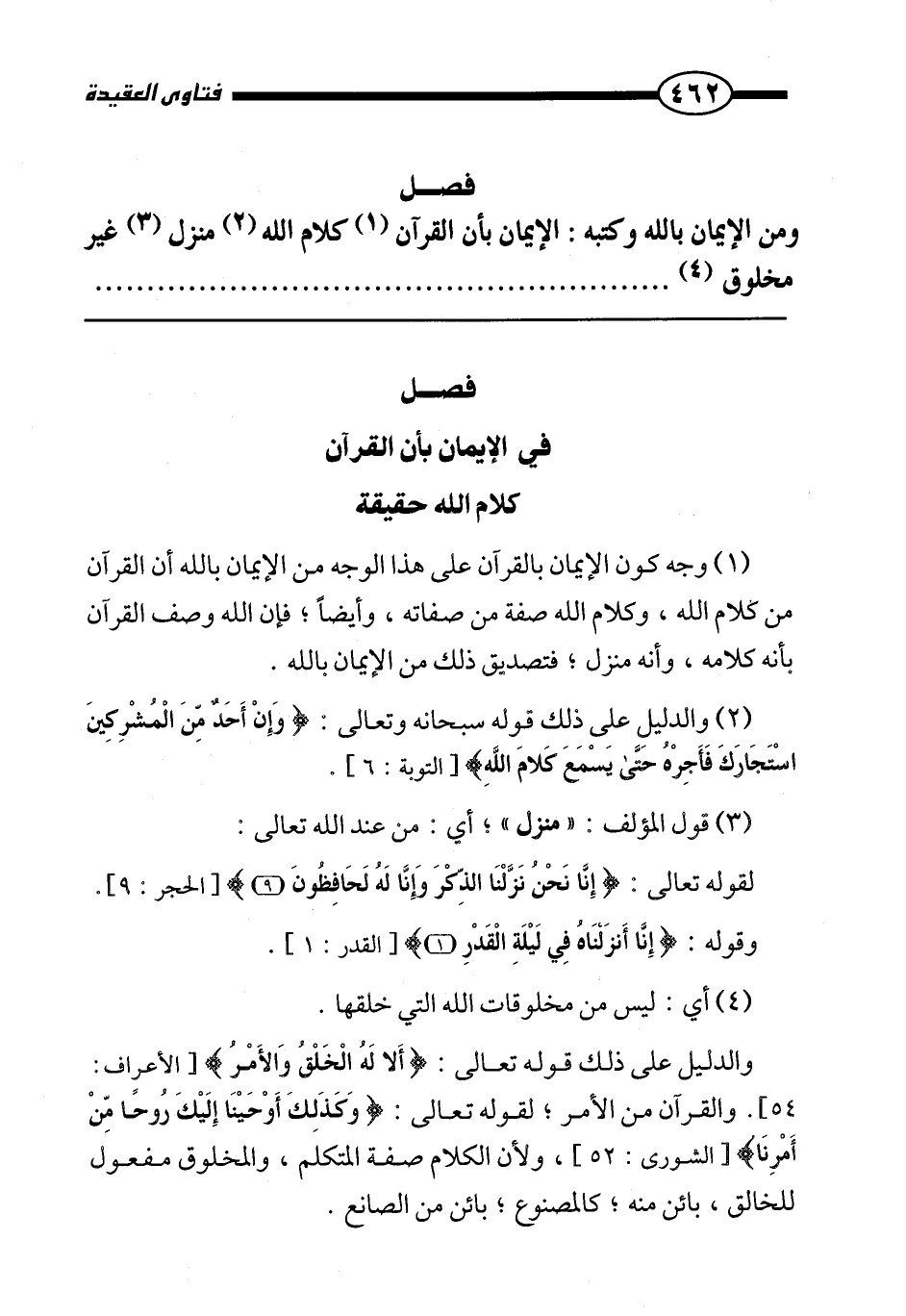 ومن الإيمان بالله وكتبه: الإيمان بأن القرآن كلام الله منزل غير مخلوق
