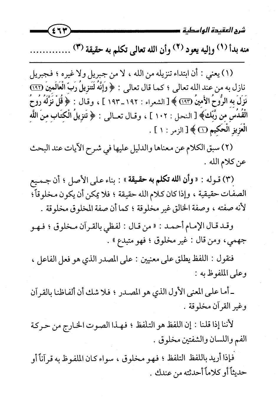 قوله: " وأن الله تكلم به حقيقة ": بناء على الأصل؛ أن جميع الصفات حقيقية، وإذا كان كلام الله حقيقة؛ فلا يمكن أن يكون مخلوقا؛ لأنه صفته، وصفة الخالق غير مخلوقة؛ كما أن صفة المخلوق مخلوقة.