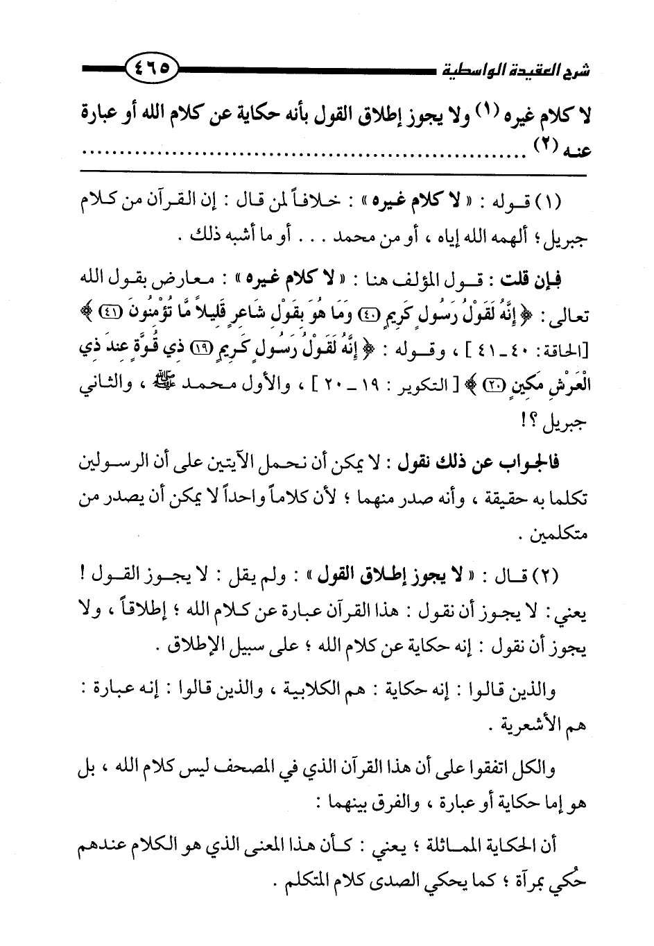 فإن قلت: قول المؤلف هنا: " لا كلام غيره ": معارض بقول الله تعالى: {إِنَّهُ لَقَوْلُ رَسُولٍ كَرِيمٍ وَمَا هُوَ بِقَوْلِ شَاعِرٍ قَلِيلًا مَا تُؤْمِنُونَ} [الحاقة: 40 - 41] ، وقوله: {إِنَّهُ لَقَوْلُ رَسُولٍ كَرِيمٍ ذِي قُوَّةٍ عِنْدَ ذِي الْعَرْشِ مَكِينٍ} [التكوير: 19 - 20] ، والأول محمد صَلَّى اللَّهُ عَلَيْهِ وَسَلَّمَ، والثاني جبريل؟!