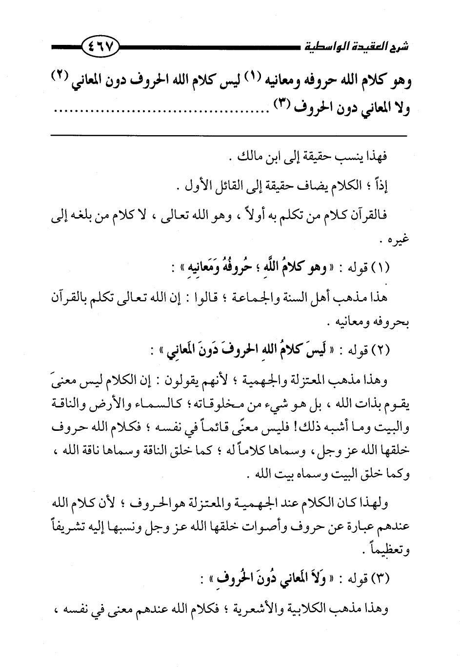 قوله: " ولا المعاني دون الحروف ": وهذا مذهب الكلابية والأشعرية؛ فكلام الله عندهم معنى في نفسه،