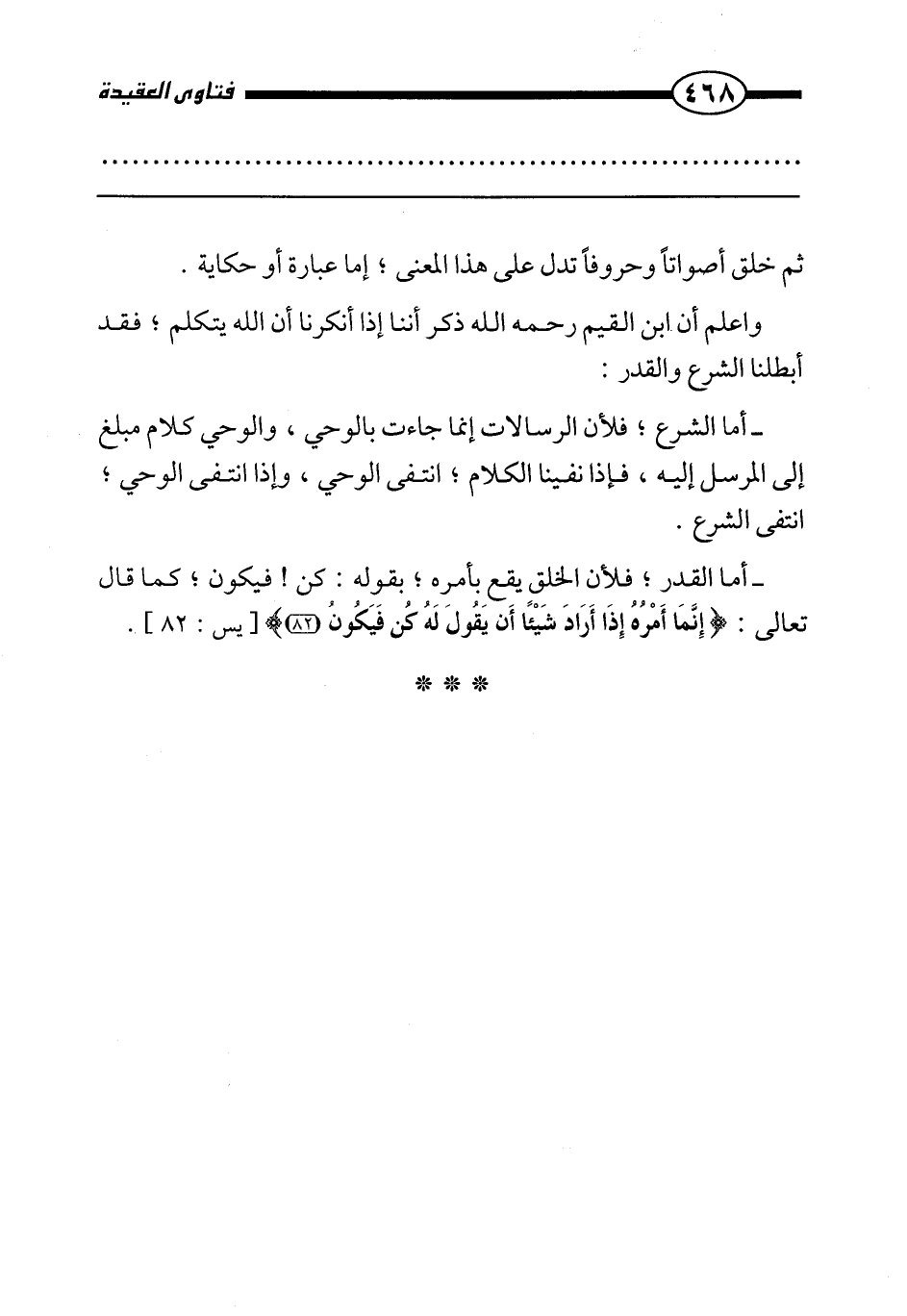 واعلم أن ابن القيم رحمه الله ذكر أننا إذا أنكرنا أن الله يتكلم؛ فقد أبطلنا الشرع والقدر.