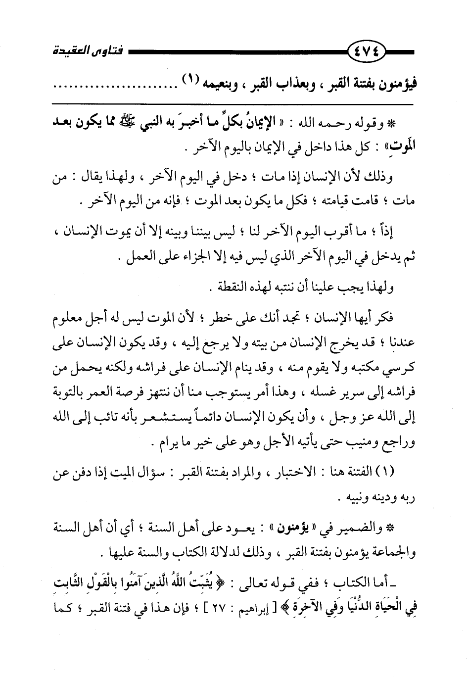 والضمير في " يؤمنون ": يعود على أهل السنة؛ أي أن أهل السنة والجماعة يؤمنون بفتنة القبر، وذلك لدلالة الكتاب والسنة عليها.