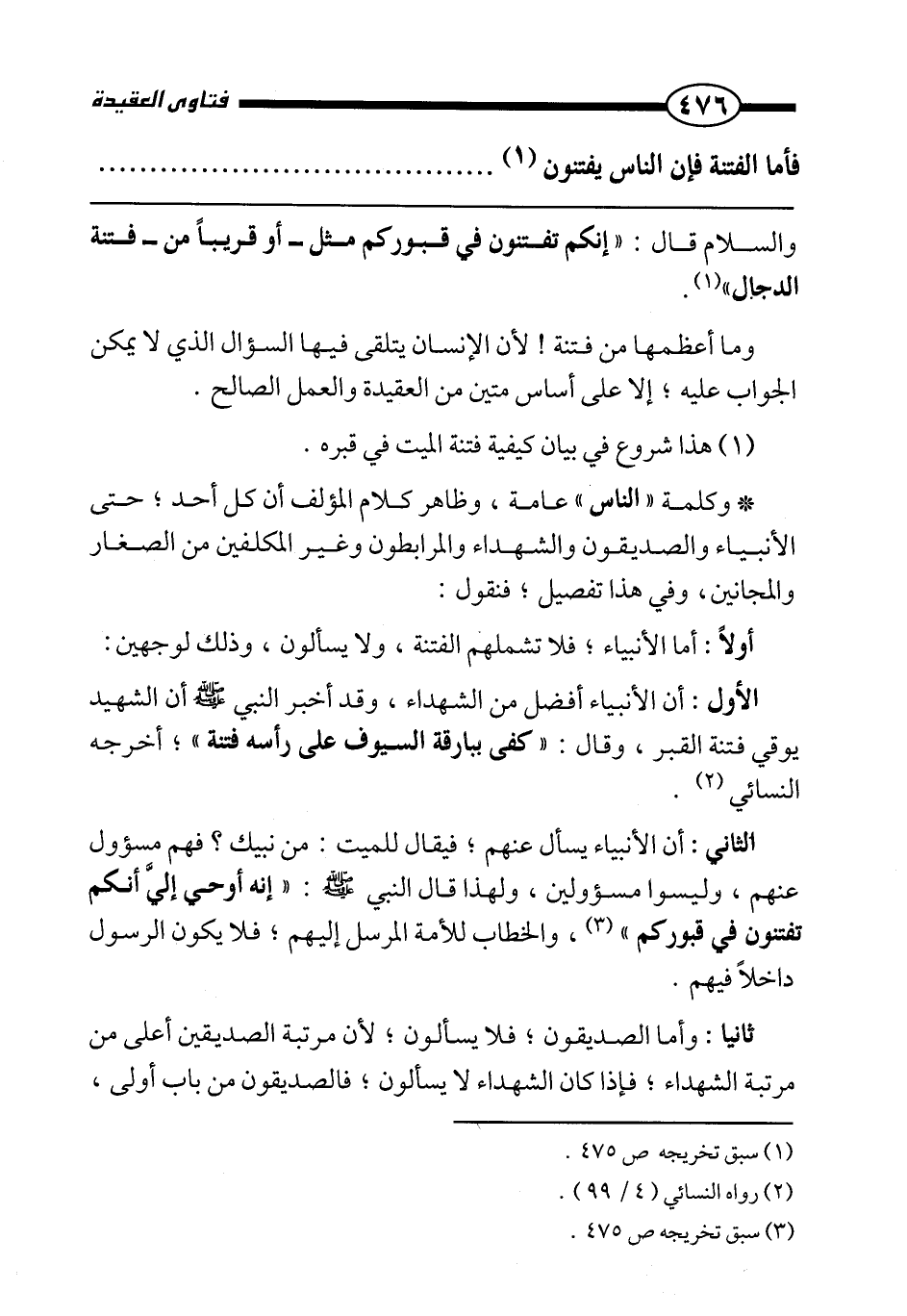 الثاني: أن الأنبياء يسأل عنهم؛ فيقال للميت: من نبيك؟ فهم مسؤول عنهم، وليسوا مسؤولين، ولهذا قال النبي صَلَّى اللَّهُ عَلَيْهِ وَسَلَّمَ: «إنه أوحي إلي أنكم تفتنون في قبوركم» ، والخطاب للأمة المرسل إليهم؛ فلا يكون الرسول داخلا فيهم.