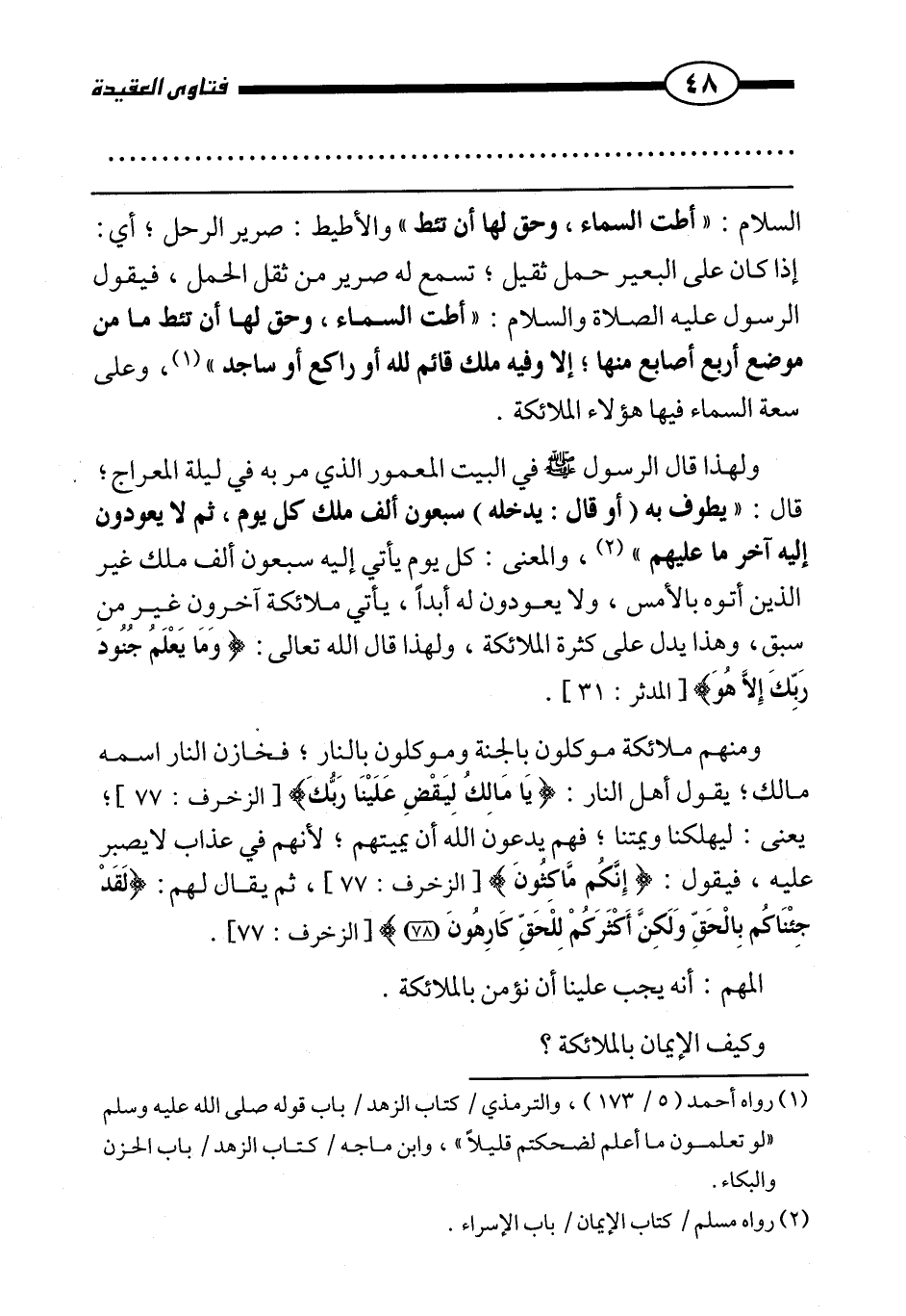 ولهذا «قال الرسول صَلَّى اللَّهُ عَلَيْهِ وَسَلَّمَ في البيت المعمور الذي مر به في ليلة المعراج؛ قال: "يطوف به (أو قال: يدخله) سبعون ألف ملك كل يوم، ثم لا يعودون إليه آخر ما عليهم» (¬2) ، والمعنى: كل يوم يأتي إليه سبعون ألف ملك غير الذين أتوه بالأمس، ولا يعودون له أبدًا، يأتي ملائكة آخرون غير من سبق، وهذا يدل على كثرة الملائكة، ولهذا قال الله تعالى: {وَمَا يَعْلَمُ جُنُودَ رَبِّكَ إِلَّا هُوَ} [المدثر: 31] .