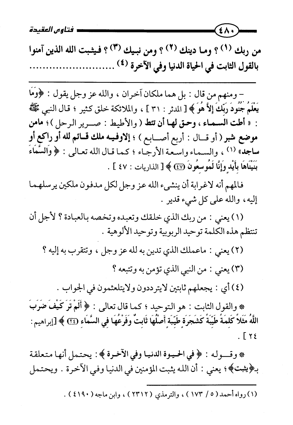 من ربك؟ وما دينك؟ ومن نبيك؟ فـ {يُثَبِّتُ اللَّهُ الَّذِينَ آمَنُوا بِالْقَوْلِ الثَّابِتِ فِي الْحَيَاةِ الدُّنْيَا وَفِي الْآخِرَةِ}
