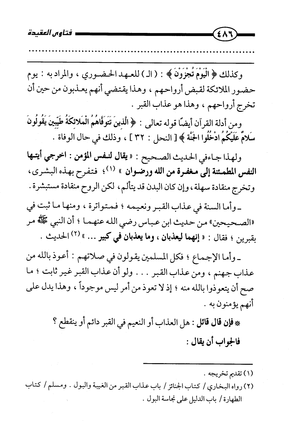 وأما السنة في عذاب القبر ونعيمه؛ فمتواترة، ومنها ما ثبت في " الصحيحين " من حديث ابن عباس رضي الله عنهما؛ أن النبي صَلَّى اللَّهُ عَلَيْهِ وَسَلَّمَ مر بقبرين؛ فقال: «إنهما ليعذبان، وما يعذبان في كبير.» . . " الحديث.