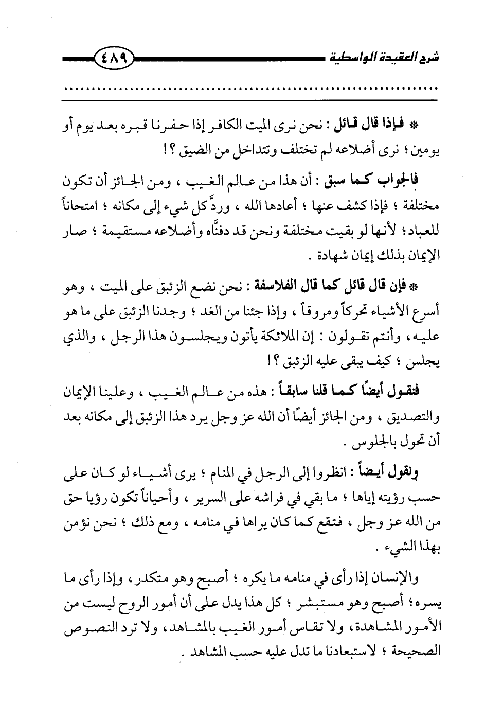 * فإن قال قائل كما قال الفلاسفة: نحن نضع الزئبق على الميت، وهو أسرع الأشياء تحركا ومروقا، وإذا جئنا من الغد؛ وجدنا الزئبق على ما هو عليه، وأنتم تقولون: إن الملائكة يأتون ويجلسون هذا الرجل، والذي يجلس؛ كيف يبقى عليه الزئبق؟ !