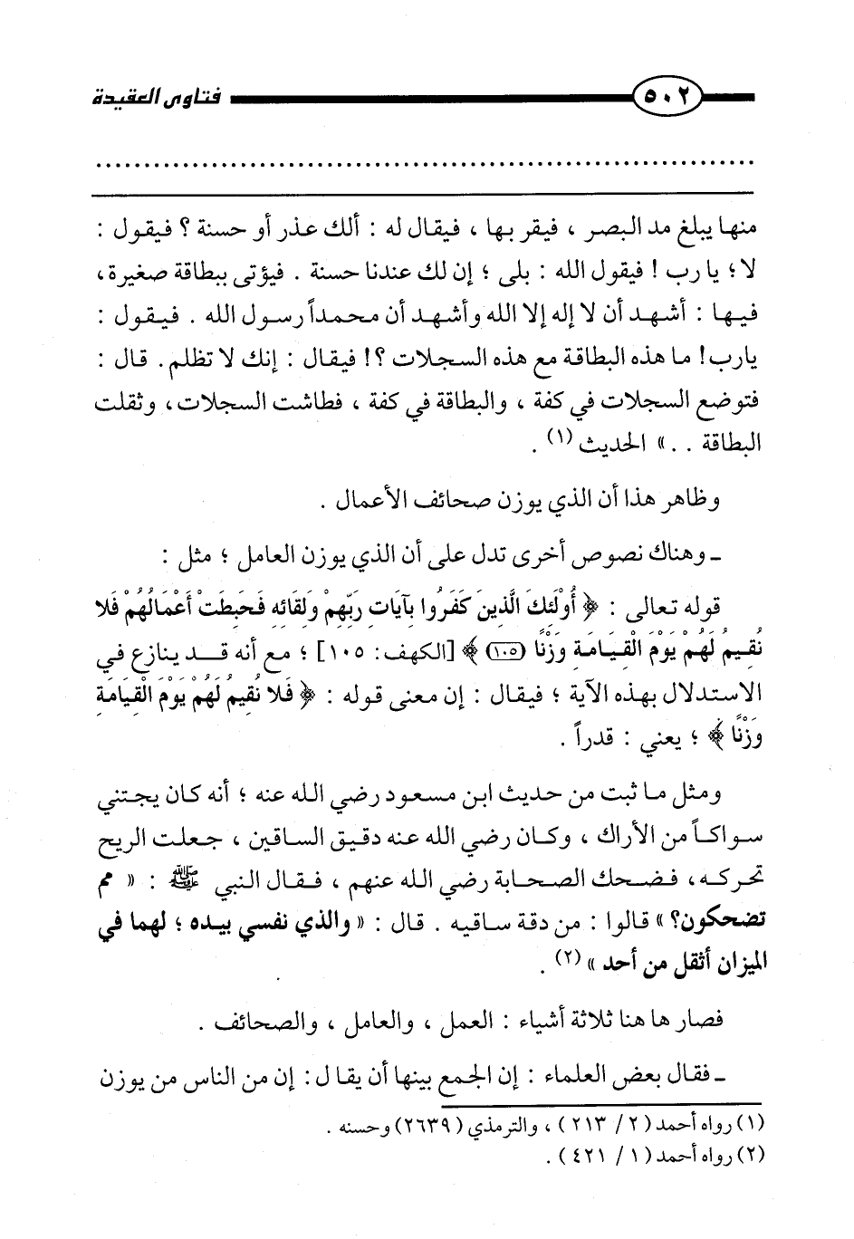 وهناك نصوص أخرى تدل على أن الذي يوزن العامل؛ مثل: قوله تعالى: {أُولَئِكَ الَّذِينَ كَفَرُوا بِآيَاتِ رَبِّهِمْ وَلِقَائِهِ فَحَبِطَتْ أَعْمَالُهُمْ فَلَا نُقِيمُ لَهُمْ يَوْمَ الْقِيَامَةِ وَزْنًا} [الكهف: 105] ؛ مع أنه قد ينازع في الاستدلال بهذه الآية؛ فيقال: إن معنى قوله: {فَلَا نُقِيمُ لَهُمْ يَوْمَ الْقِيَامَةِ وَزْنًا} ؛ يعني: قدرا.