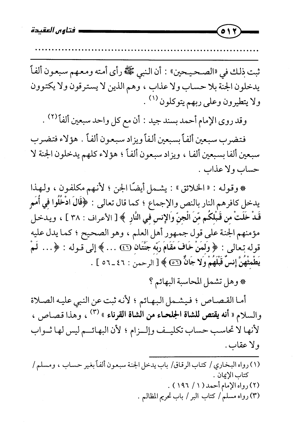 * وقوله: " الخلائق ": يشمل أيضا الجن؛ لأنهم مكلفون، ولهذا يدخل كافرهم النار بالنص والإجماع؛ كما قال تعالى: {قَالَ ادْخُلُوا فِي أُمَمٍ قَدْ خَلَتْ مِنْ قَبْلِكُمْ مِنَ الْجِنِّ وَالْإِنْسِ فِي النَّارِ} [الأعراف: 38] ، ويدخل مؤمنهم الجنة على قول جمهور أهل العلم، وهو الصحيح؛ كما يدل عليه قوله تعالى: {وَلِمَنْ خَافَ مَقَامَ رَبِّهِ جَنَّتَانِ} إلى قوله: {لَمْ يَطْمِثْهُنَّ إِنْسٌ قَبْلَهُمْ وَلَا جَانٌّ} [الرحمن: 46 - 56] .