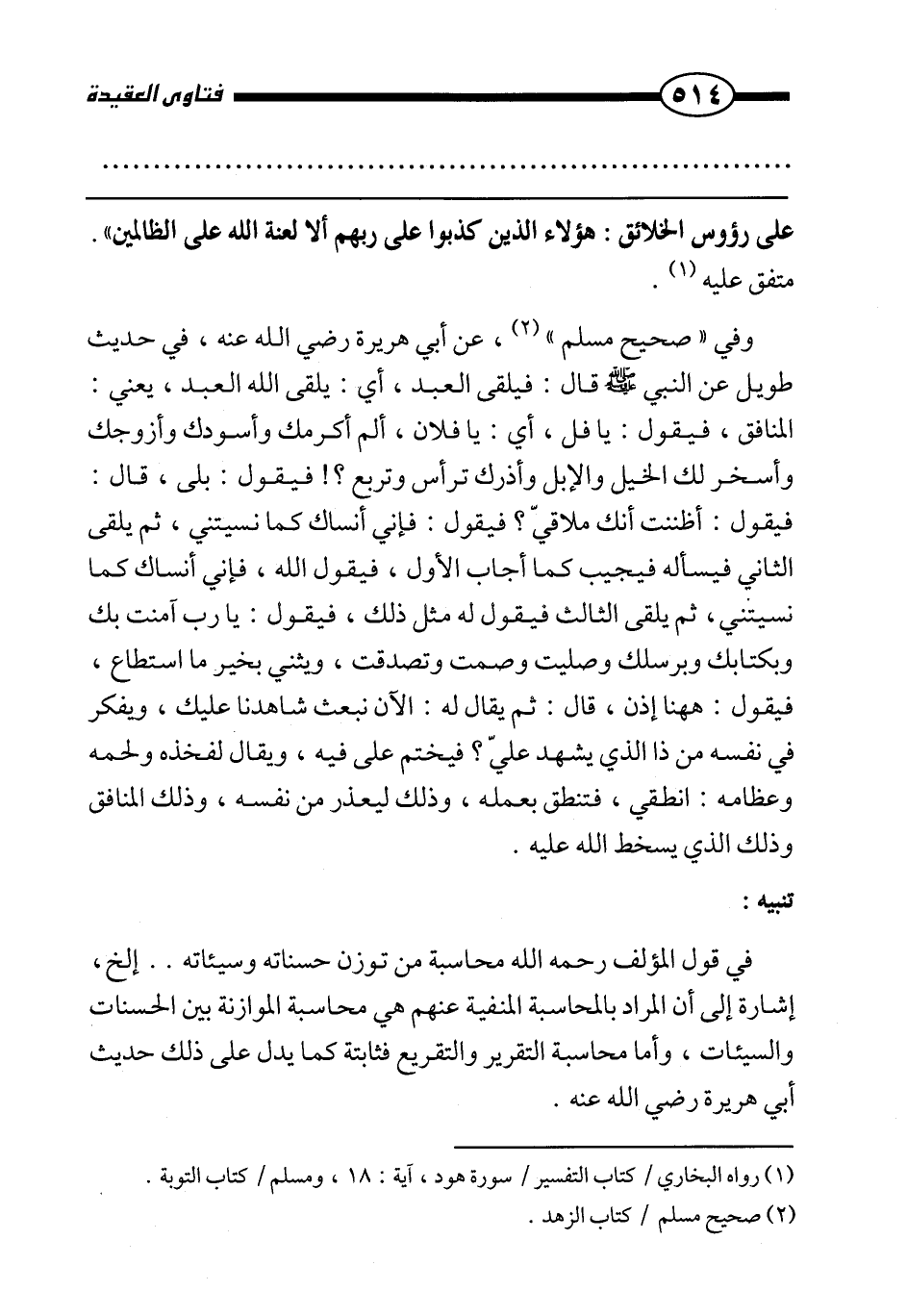 «على رؤوس الخلائق: هؤلاء الذين كذبوا على ربهم ألا لعنة الله على الظالمين» . متفق عليه.