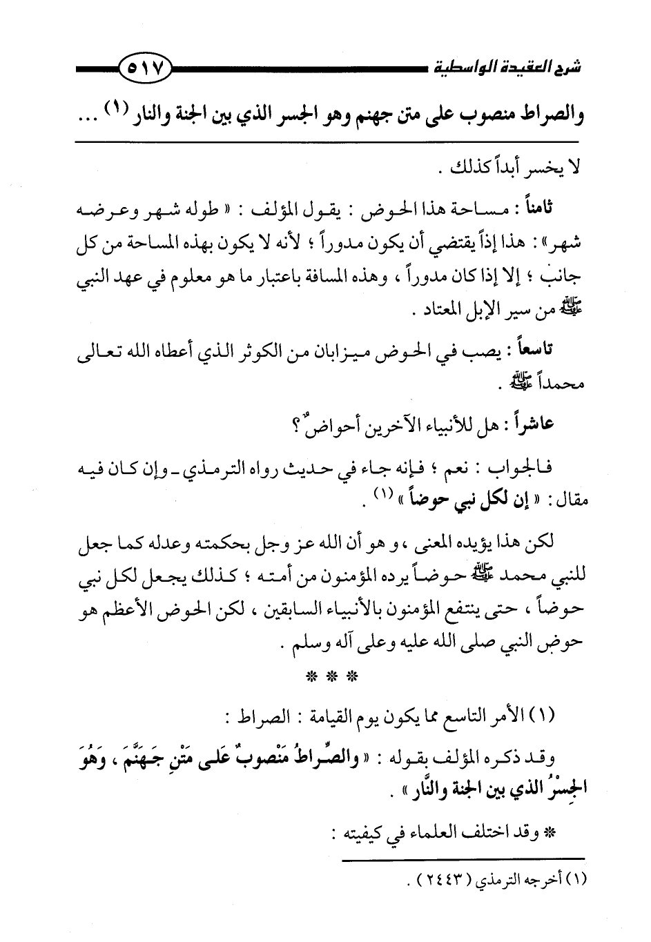 وقد ذكره المؤلف بقوله: " والصراط منصوب على متن جهنم، وهو الجسر الذي بين الجنة والنار ".