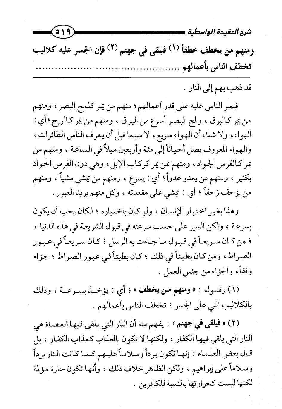 وهذا بغير اختيار الإنسان، ولو كان باختياره؛ لكان يحب أن يكون بسرعة، ولكن السير على حسب سرعته في قبول الشريعة في هذه الدنيا، فمن كان سريعا في قبول ما جاءت به الرسل؛ كان سريعا في عبور الصراط، ومن كان بطيئا في ذلك؛ كان بطيئا في عبور الصراط؛ جزاء وفقا، والجزاء من جنس العمل.