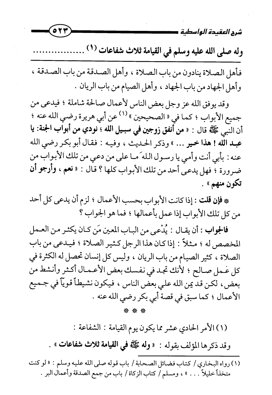 وقد يوفق الله عز وجل بعض الناس لأعمال صالحة شاملة؛ فيدعى من جميع الأبواب؛ كما في " الصحيحين "عن أبي هريرة رضي الله عنه؛ أن النبي صَلَّى اللَّهُ عَلَيْهِ وَسَلَّمَ قال: «من أنفق زوجين في سبيل الله؛ نودي من أبواب الجنة: يا عبد الله! هذا خير. . .» وذكر الحديث، وفيه: «فقال أبو بكر رضي الله عنه: بأبي أنت وأمي يا رسول الله ما على من دعي من تلك الأبواب من ضرورة؛ فهل يدعى أحد من تلك الأبواب كلها؟ قال: " نعم، وأرجو أن تكون منهم» .