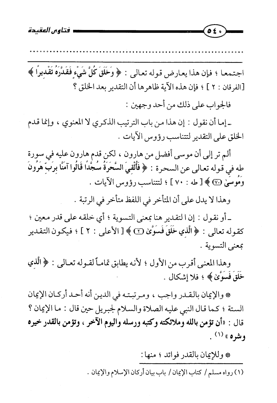 * والإيمان بالقدر واجب، ومرتبته في الدين أنه أحد أركان الإيمان الستة؛ كما قال النبي عليه الصلاة والسلام لجبريل حين قال: ما الإيمان؟ قال: «أن تؤمن بالله وملائكته وكتبه ورسله واليوم الآخر، وتؤمن بالقدر خيره وشره» .