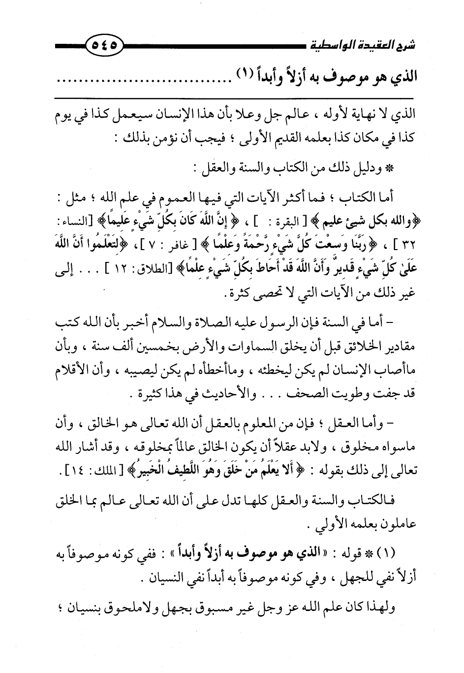 * قوله: " الذي هو موصوف به أزلا وأبدا ": ففي كونه موصوفا به أزلا نفي للجهل، وفي كونه موصوفا به أبدا نفي النسيان.