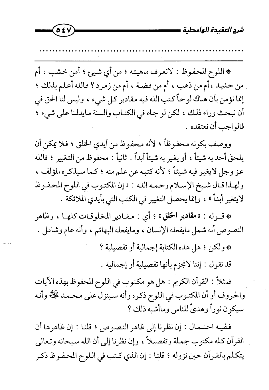 * اللوح المحفوظ: لا نعرف ماهيته؛ من أي شيء؛ أمن خشب، أم من حديد، أم من ذهب، أم من فضة، أم من زمرد،؟ فالله أعلم بذلك؛ إنما نؤمن بأن هناك لوحا كتب الله فيه مقادير كل شيء، وليس لنا الحق في أن نبحث وراء ذلك، لكن لو جاء في الكتاب والسنة ما يدلنا على شيء؛ فالواجب أن نعتقده.